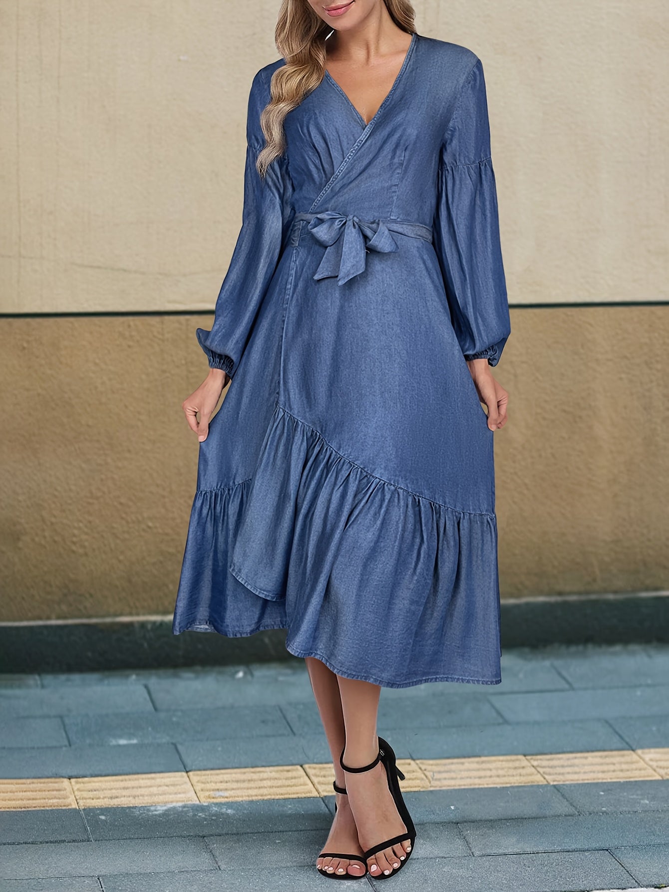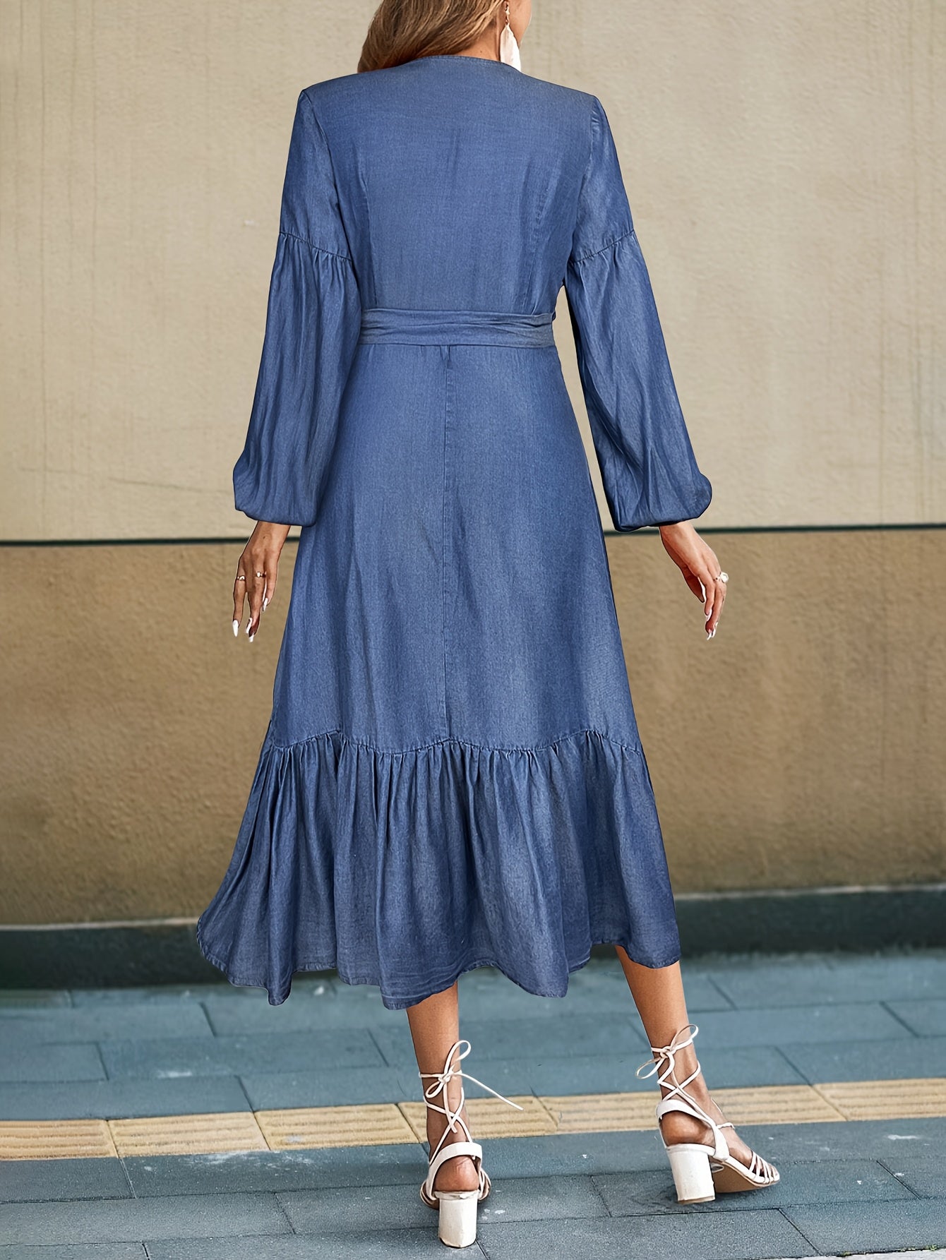 Women's Casual Denim Dress with Elastic Waistband and Pleated Skirt - Long Sleeve, Lightweight Lyocell Fabric, Solid Washed Blue