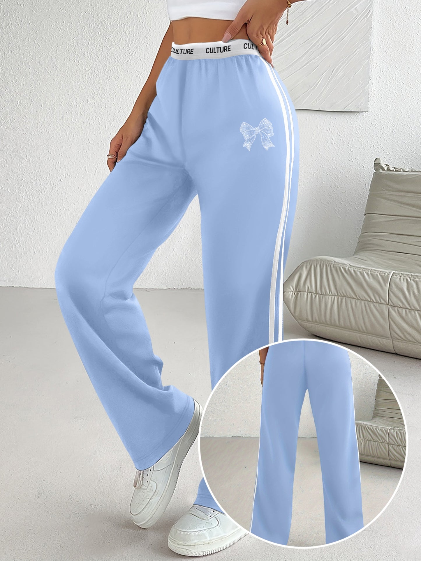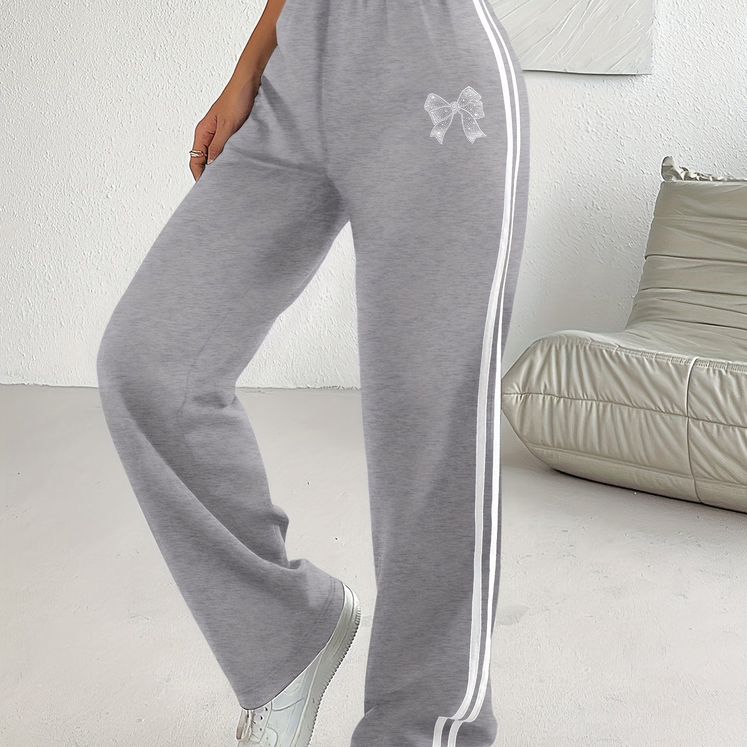 Women's Casual Geometric Pattern Sweatpants with Bowknot Print and Stripes, High-Waisted Loose Fit Wide Leg Pants, All-Season Knit Fabric, Polyester, Adult - K16