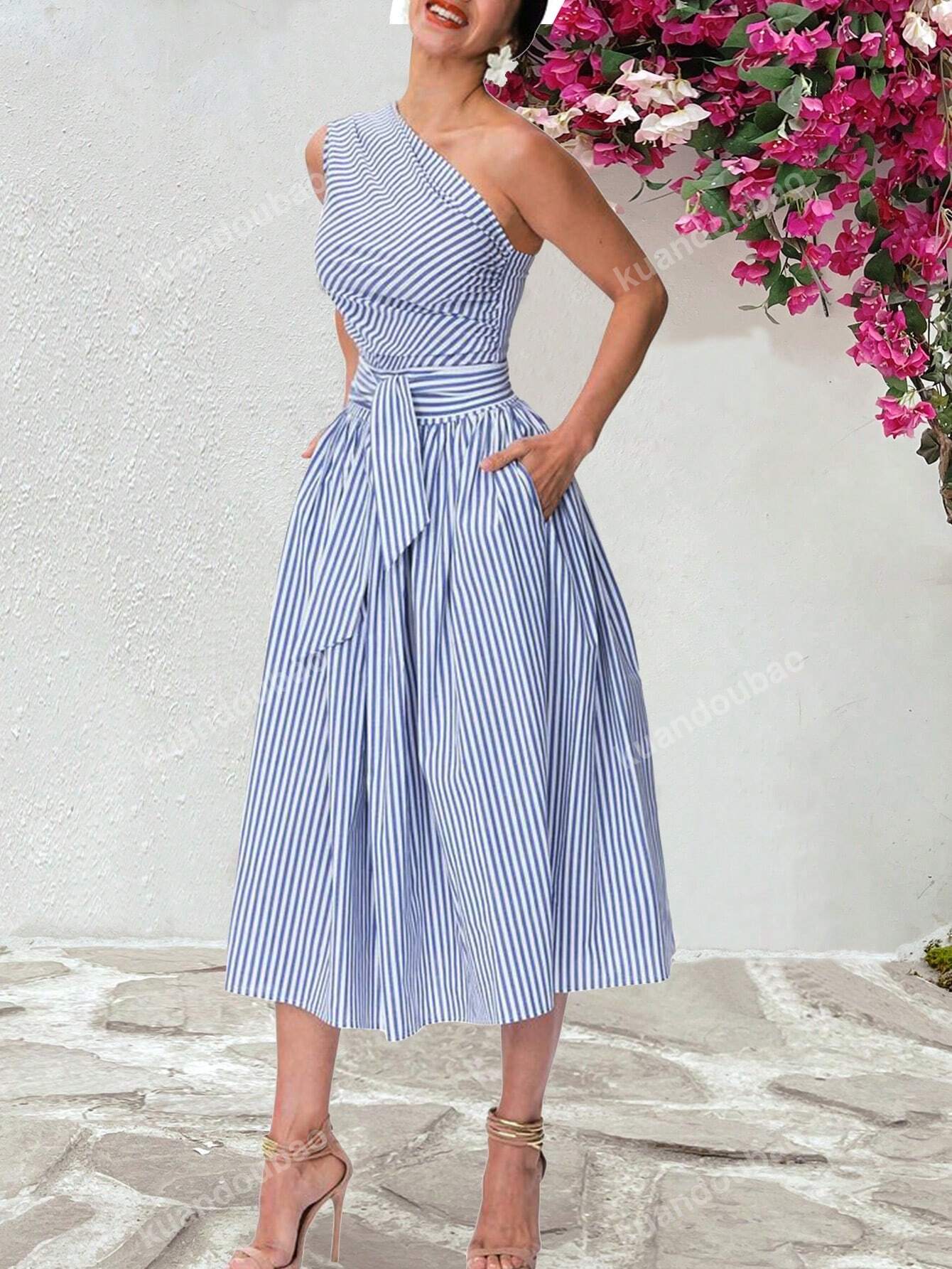 Women's Casual Loose Fit Striped Print Sleeveless Dress With Waist Belt - Floral Pattern Random
