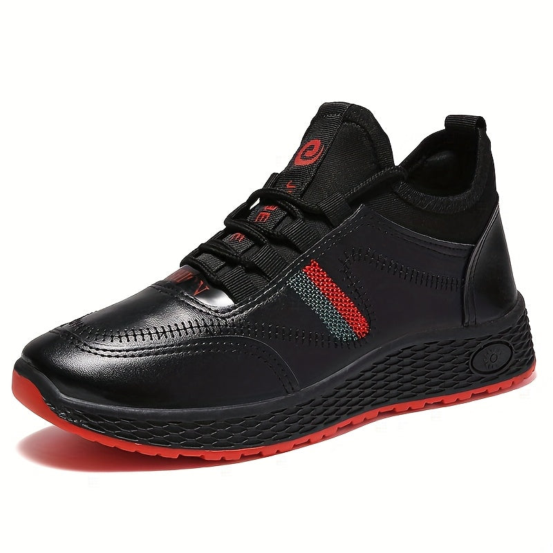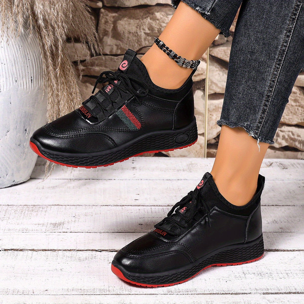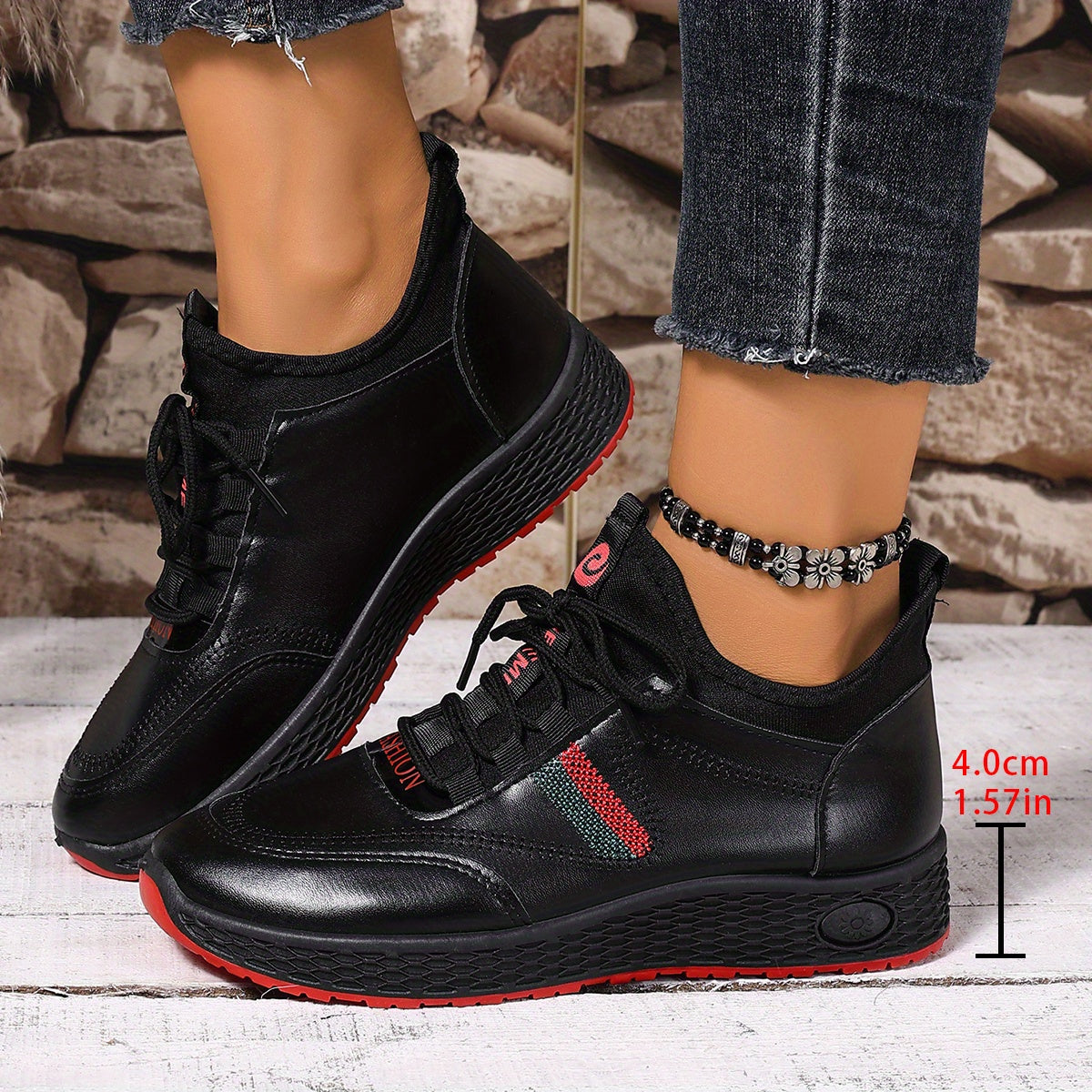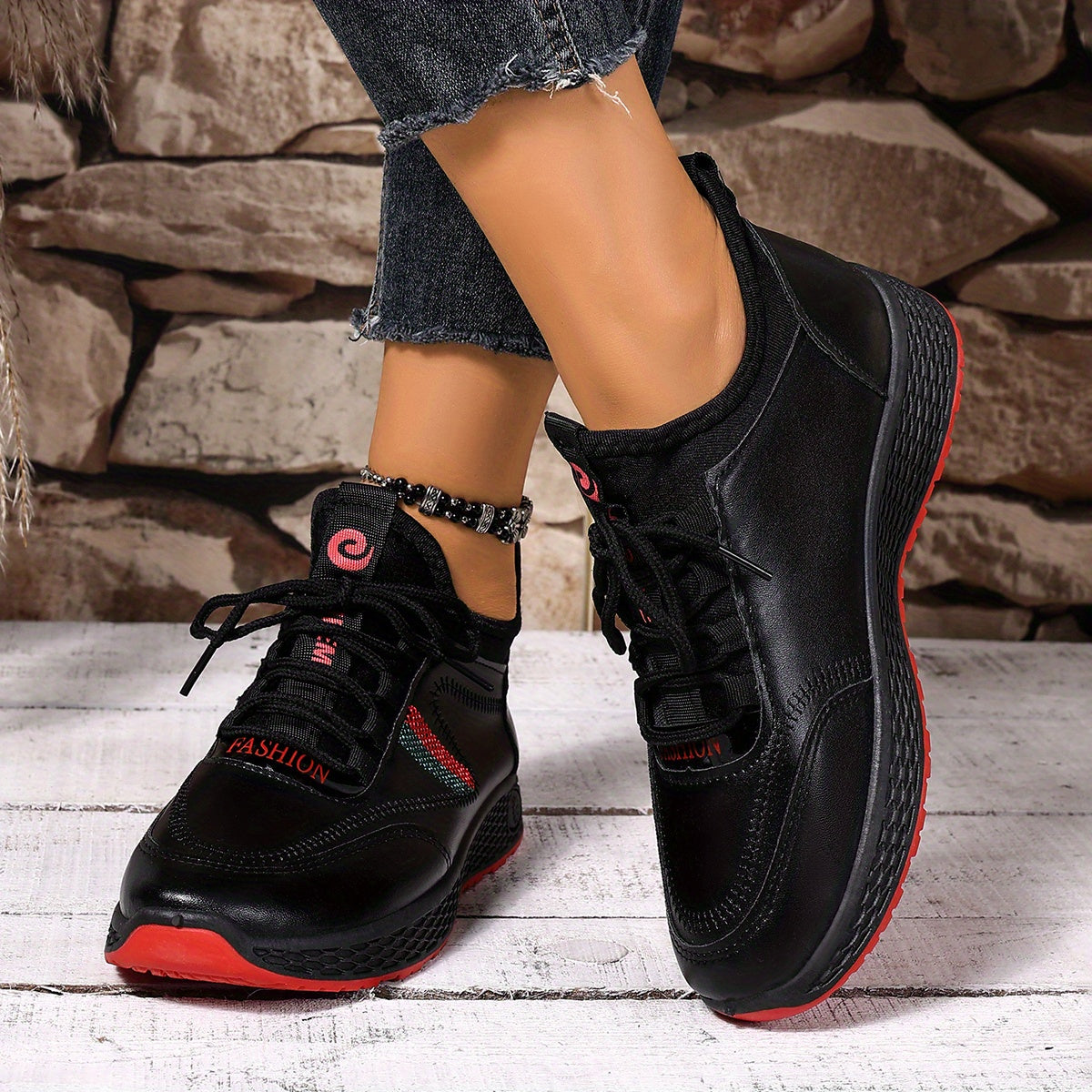 Women'S Casual Sneakers - Black Synthetic Cover Low-Top Lace-Up Shoes with Red Accents, Non-Slip Rubber Sole, Comfortable Fabric Lining for All-Season Wear, Casual Footwear | Stylish Casual Shoes | Durable Rubber Sole