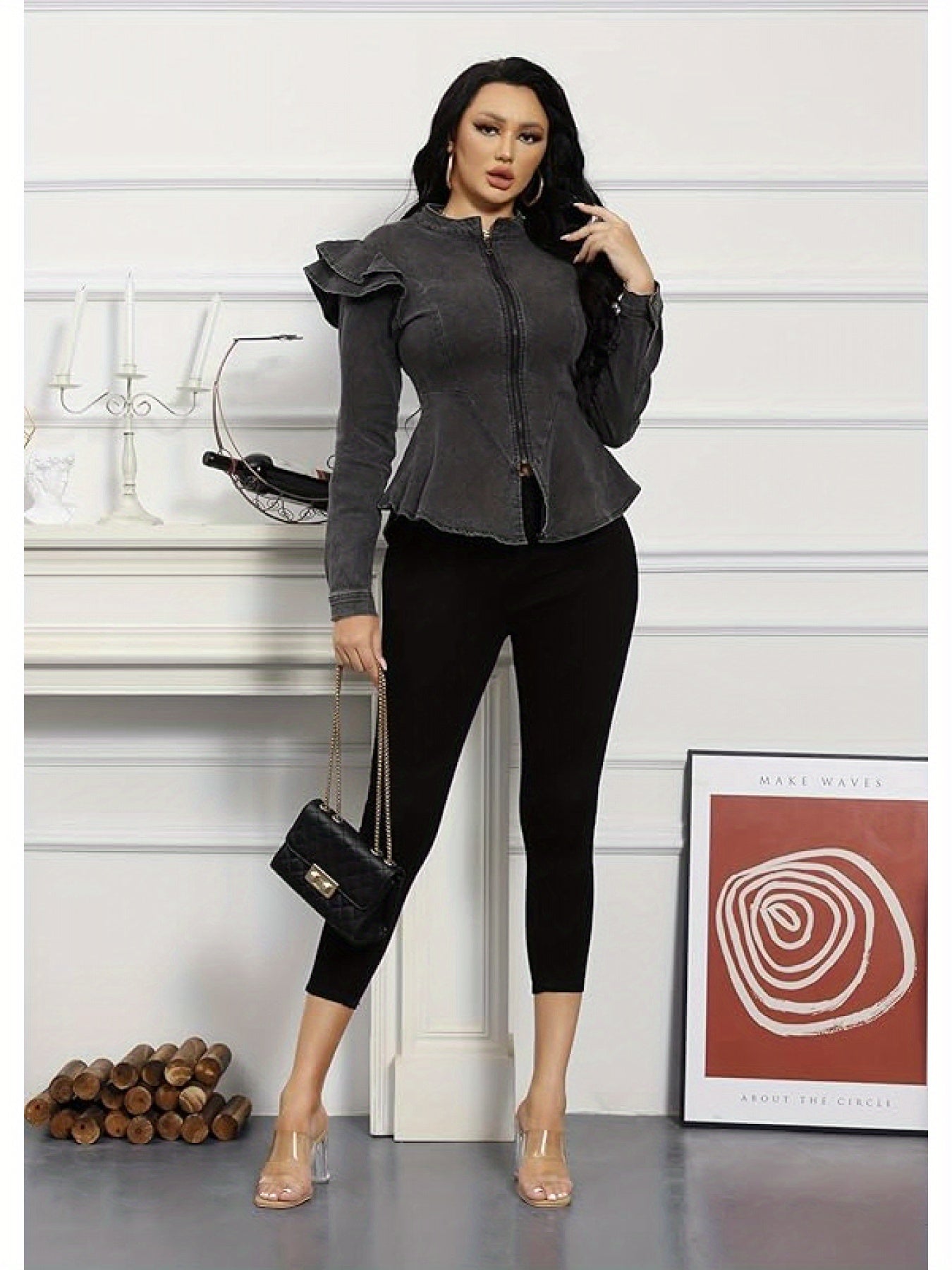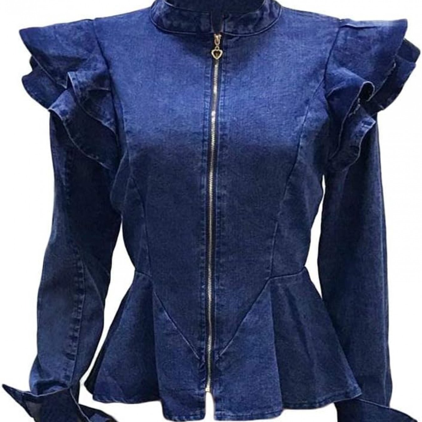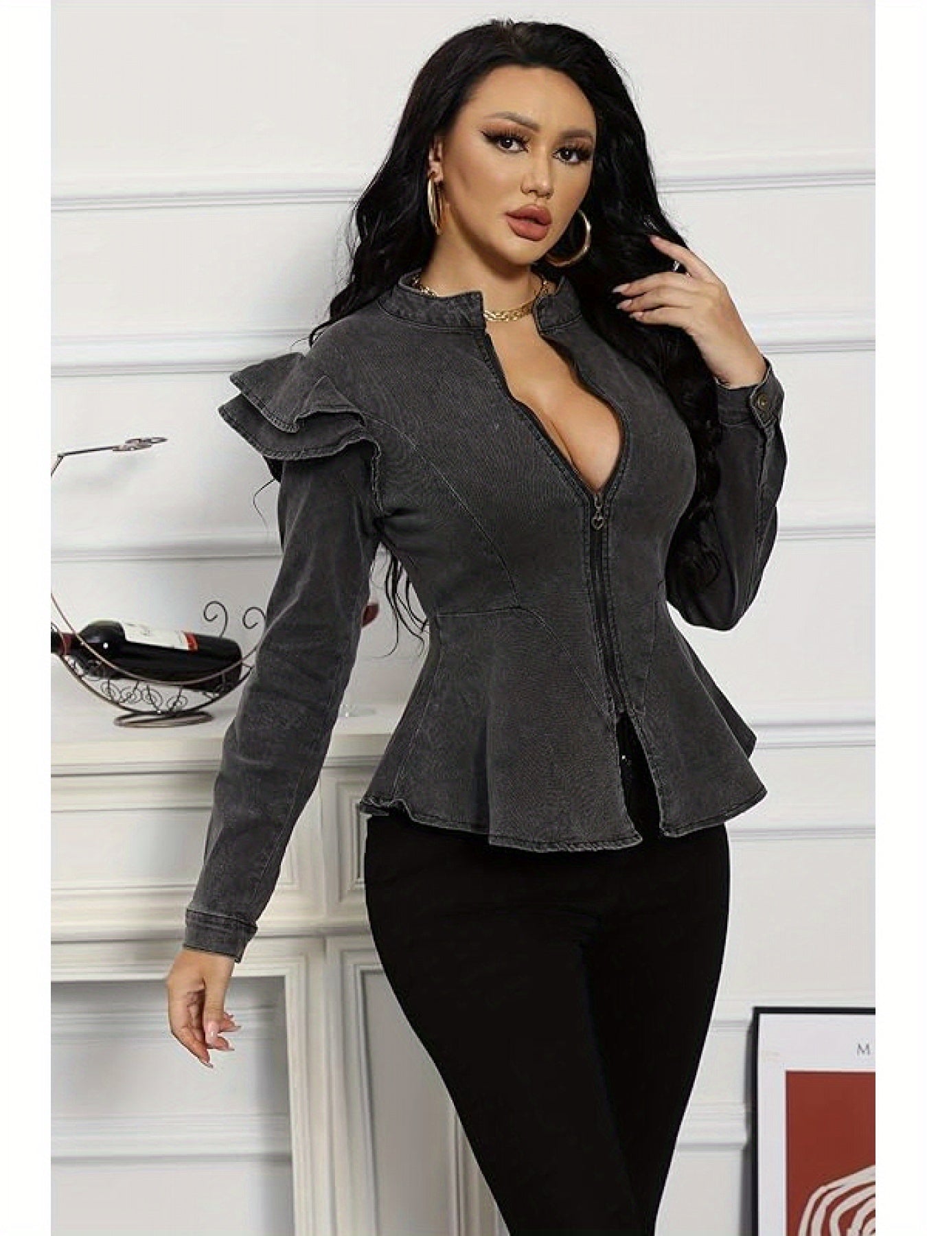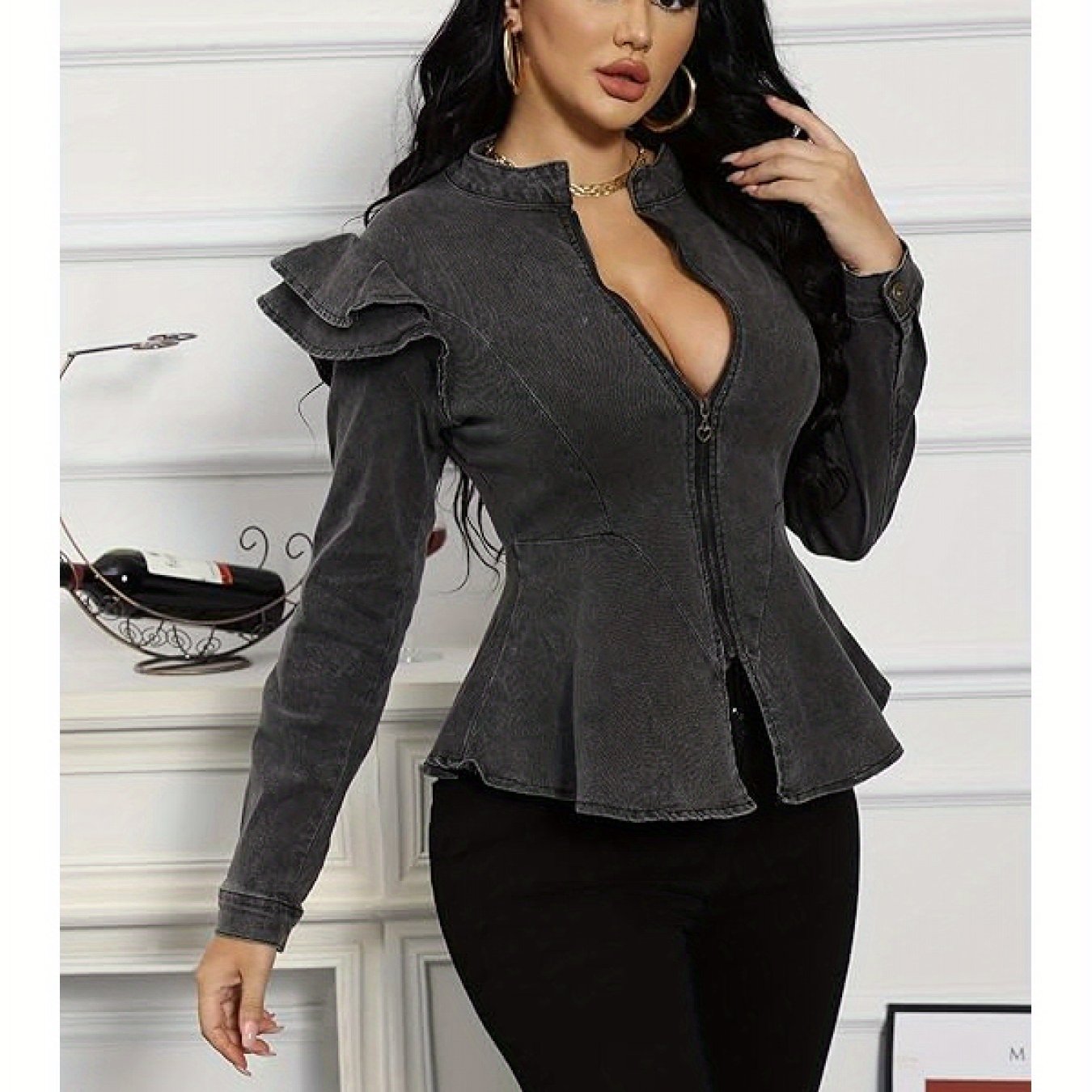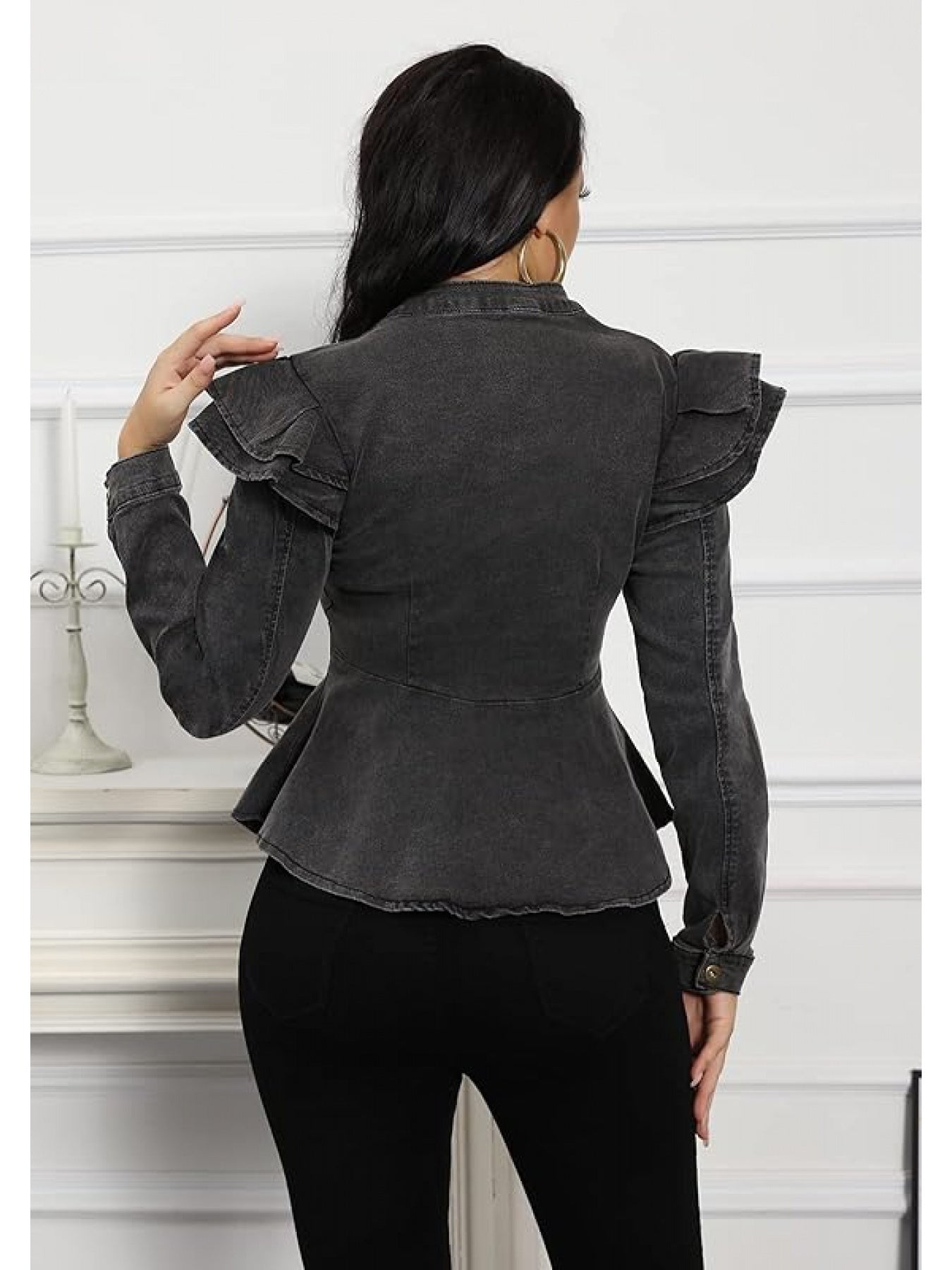 Women's Chic Gray Denim Jacket - Long Sleeve, Full Zip/Button Closure, Frilled Shoulders, Ruffle Hem Peplum Coat, Ideal for Casual Fall/Winter Fashion