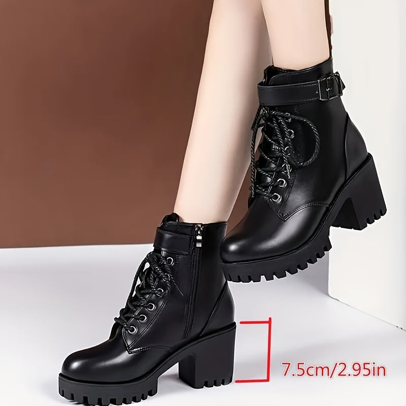 Women's Chunky Heel Ankle Boots with Round Toe & Zipper Closure - Black Faux Cover, Side Buckle Straps, Comfortable Rubber Sole & Fabric Lining for Casual & Formal Outfits, Stylish Outfit Footwear, Durable Footwear Construction, Casual Attire, Quality Cra