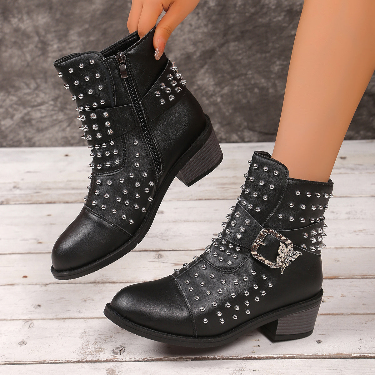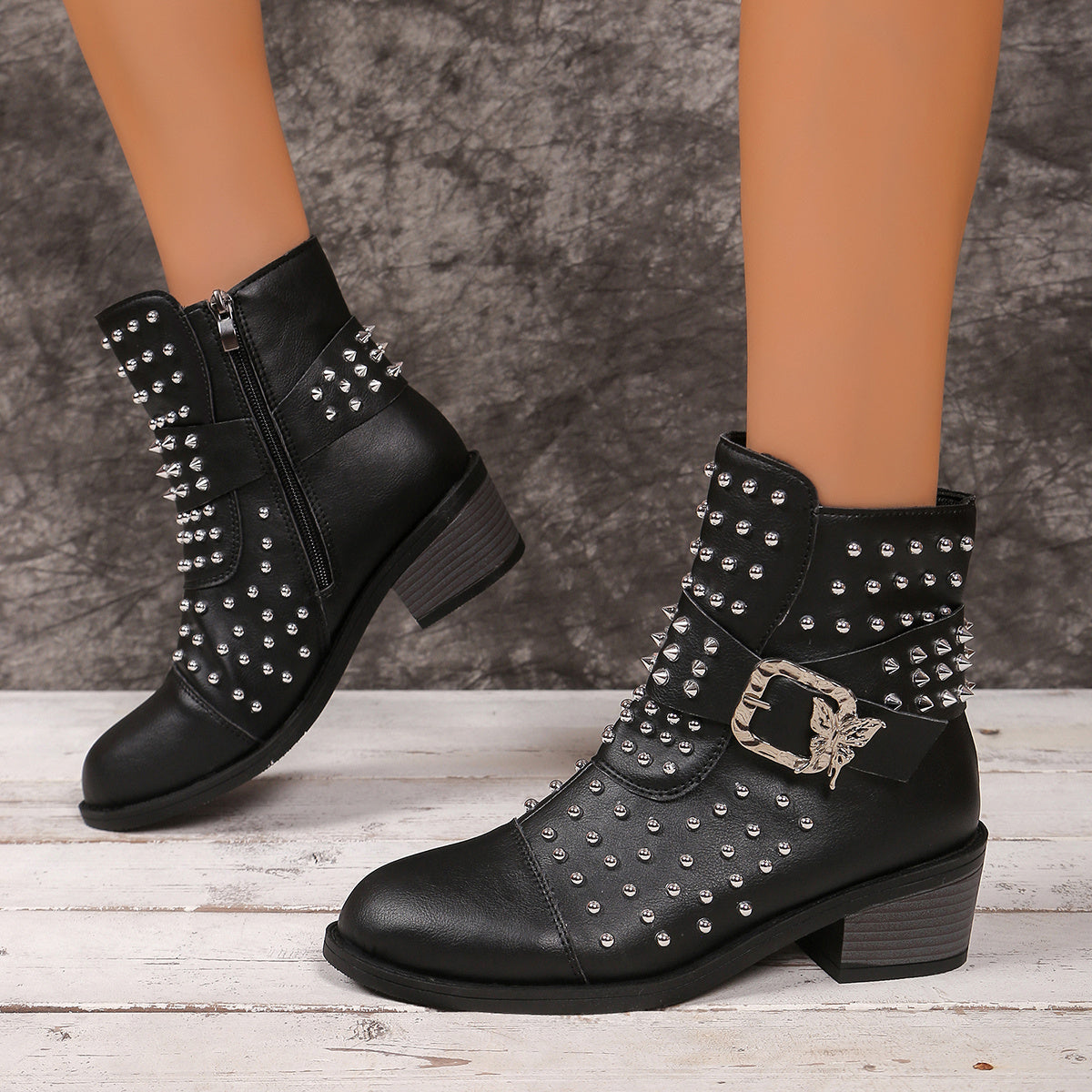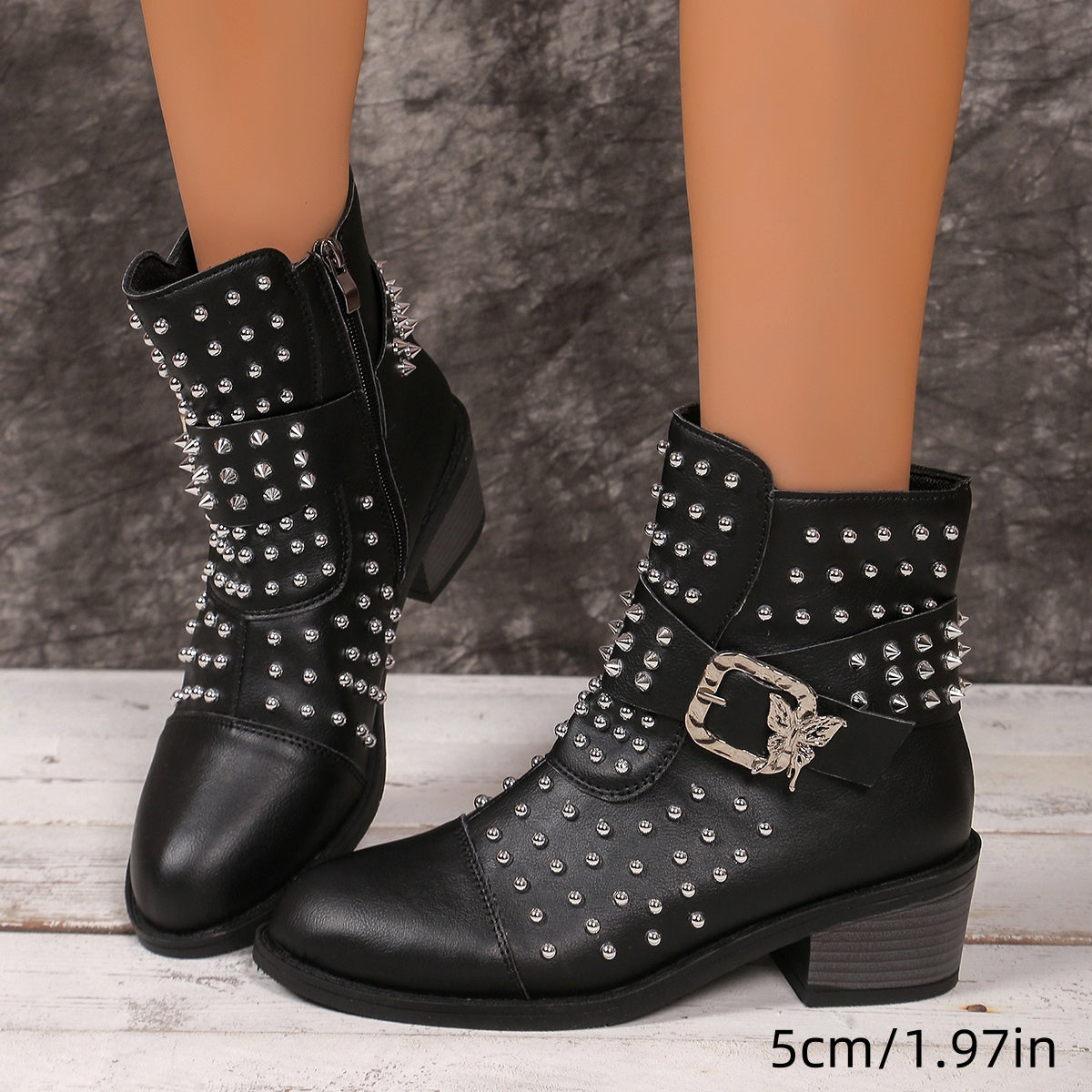 Women'S Chunky Mid-Heel Ankle Boots with Metallic Studs - Synthetic Cover Round Toe Zipper Closure, Black & White Contrast Design, Plus Size Available, Rubber Sole & Fabric Lining for Casual & Formal Outfits, Formal Footwear, Durable Traction Footwear, Ev