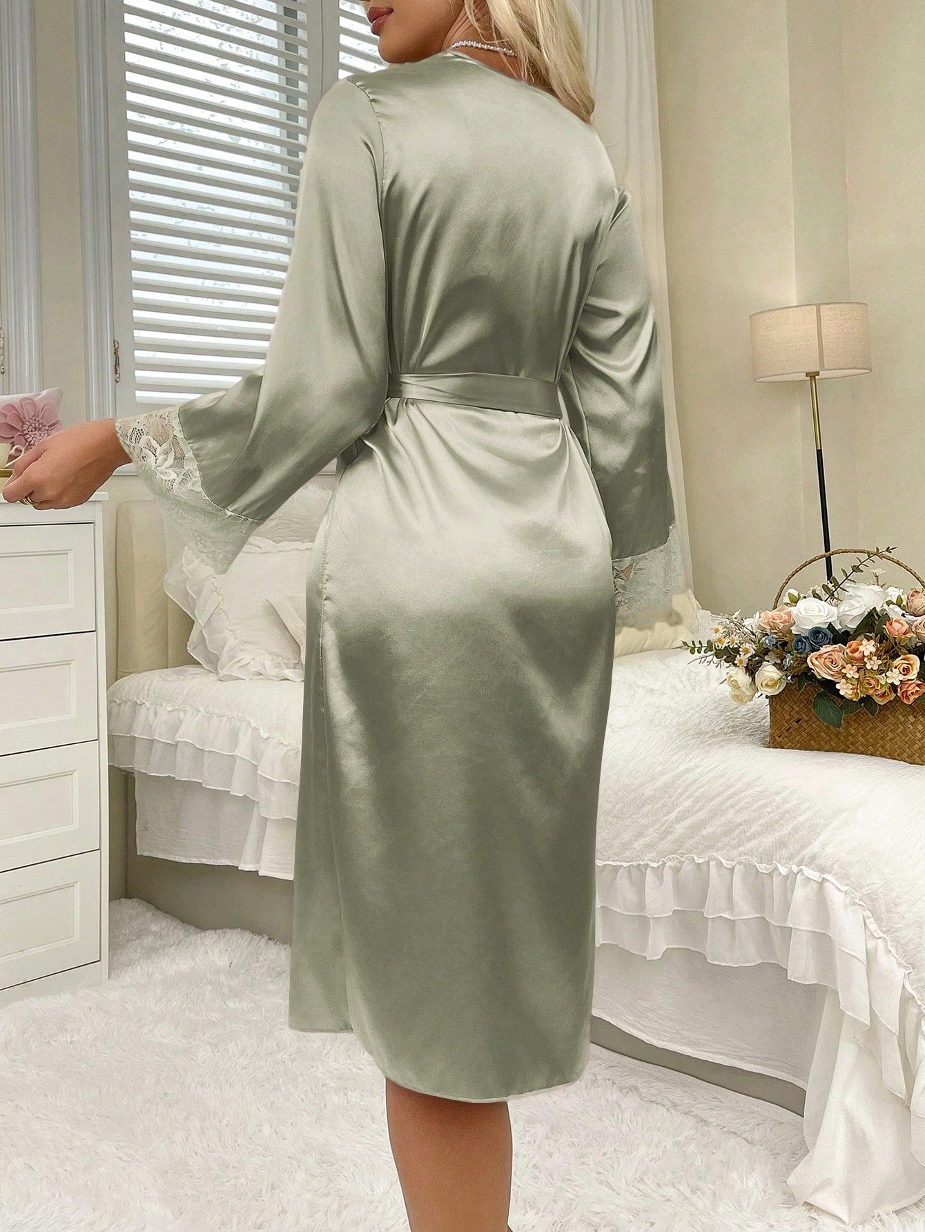 Women's Deep V-Neck Long Sleeve Tie Waist Split Hemline Elegant Robe