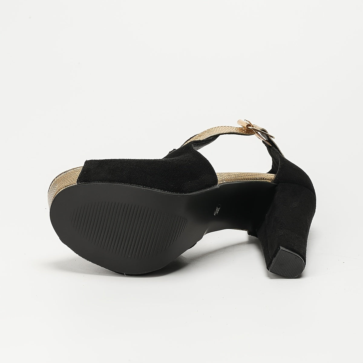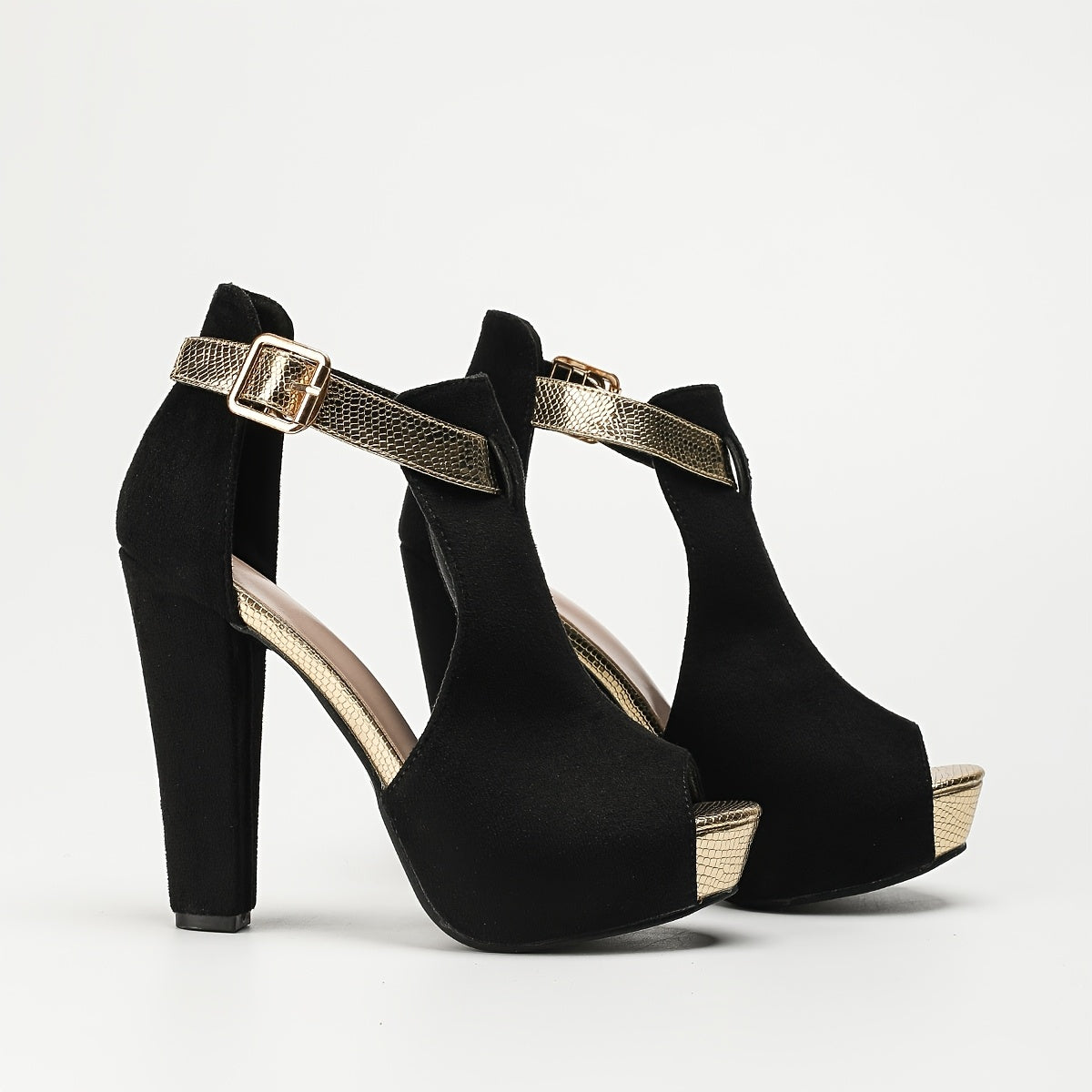 Women's Elegant Black Cover & Golden Ankle Strap High Heels - Thick Platform Open-Toe Summer Shoes with Rhinestone Accents, Ultra-High Block Heels & TPU Sole for Parties, Weddings, Formal Events, Formal Footwear | Stylish Cover Shoes | Synthetic Cover Sho