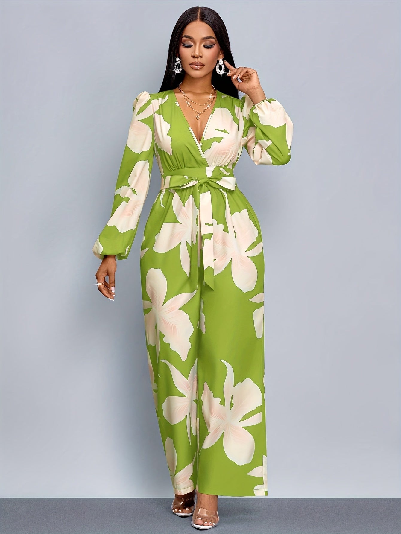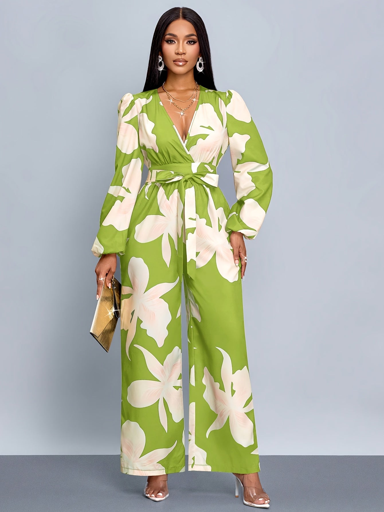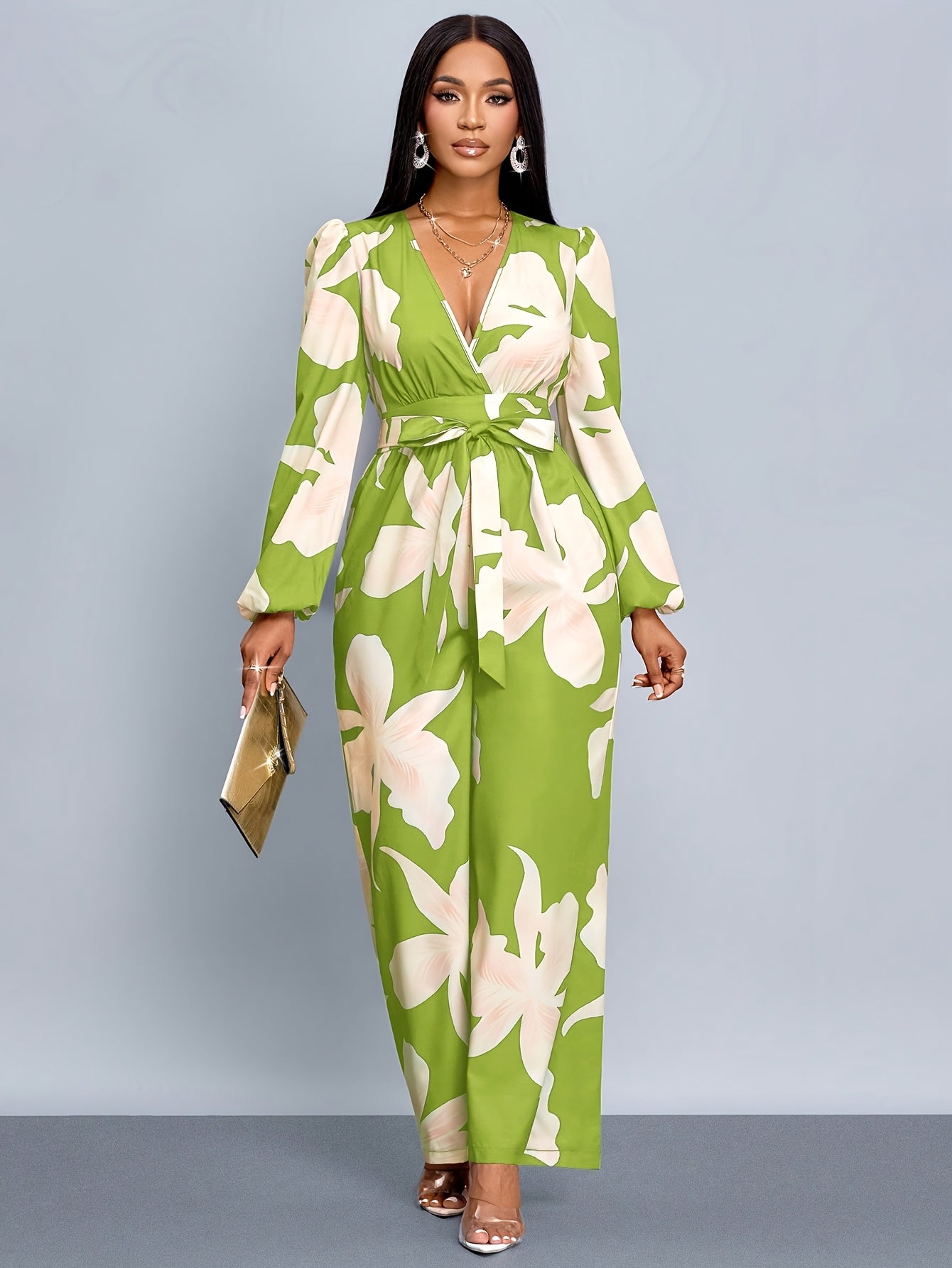 Women's Elegant Floral Print Wide-Leg Jumpsuit with Lantern Sleeves, V-Neck, and Belt - Green and Beige Floral Print Design, Polyester Fabric, Perfect for Spring/Summer/Fall