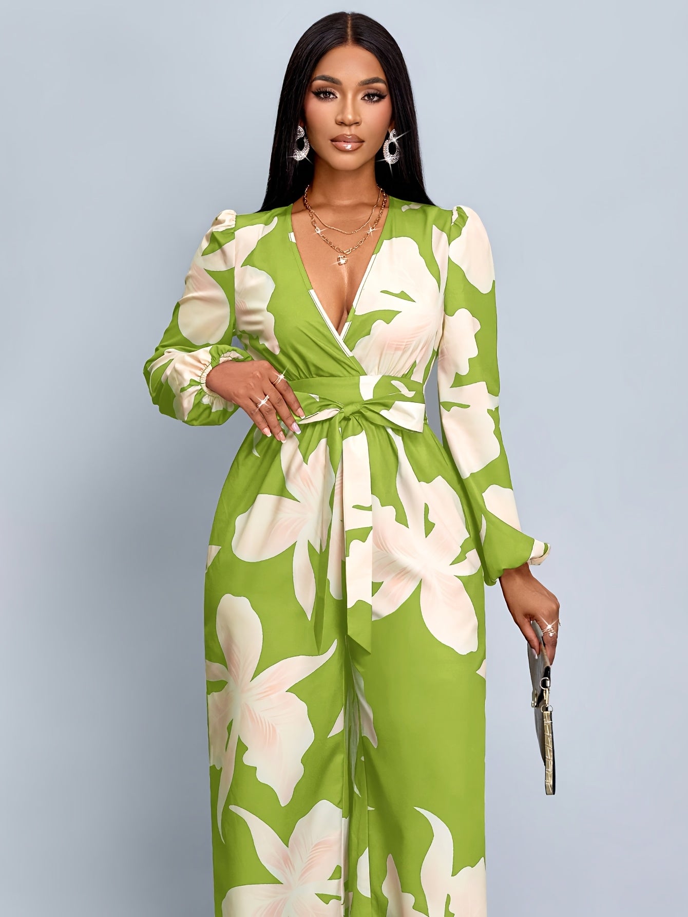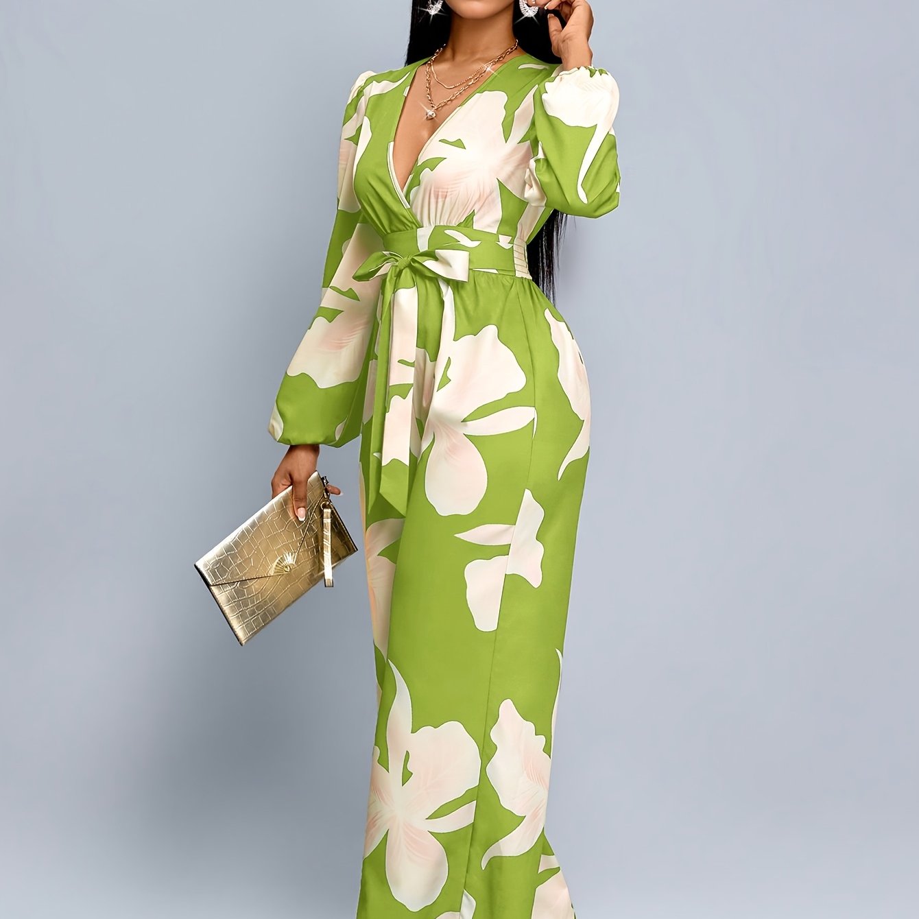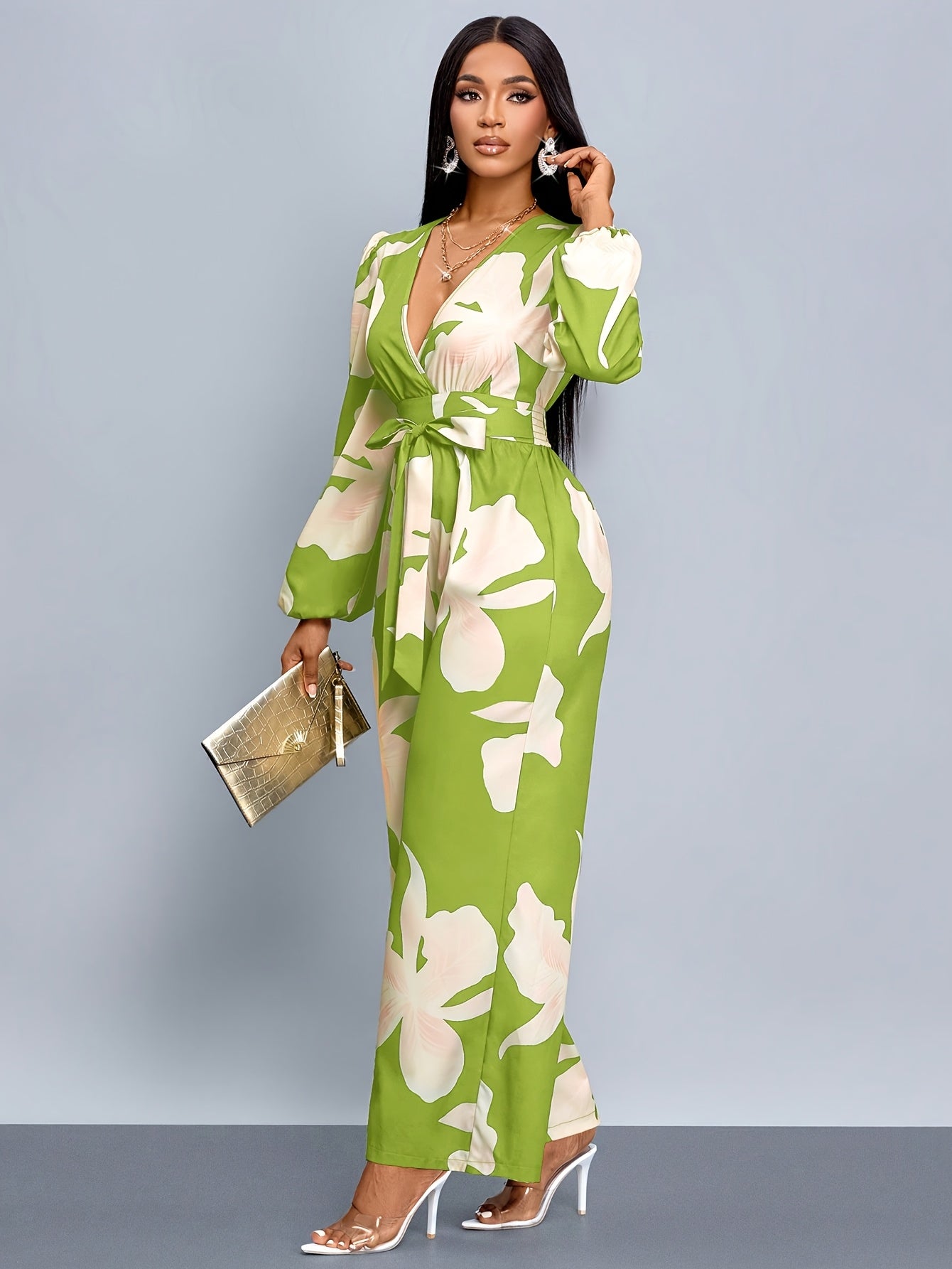 Women's Elegant Floral Print Wide-Leg Jumpsuit with Lantern Sleeves, V-Neck, and Belt - Green and Beige Floral Print Design, Polyester Fabric, Perfect for Spring/Summer/Fall