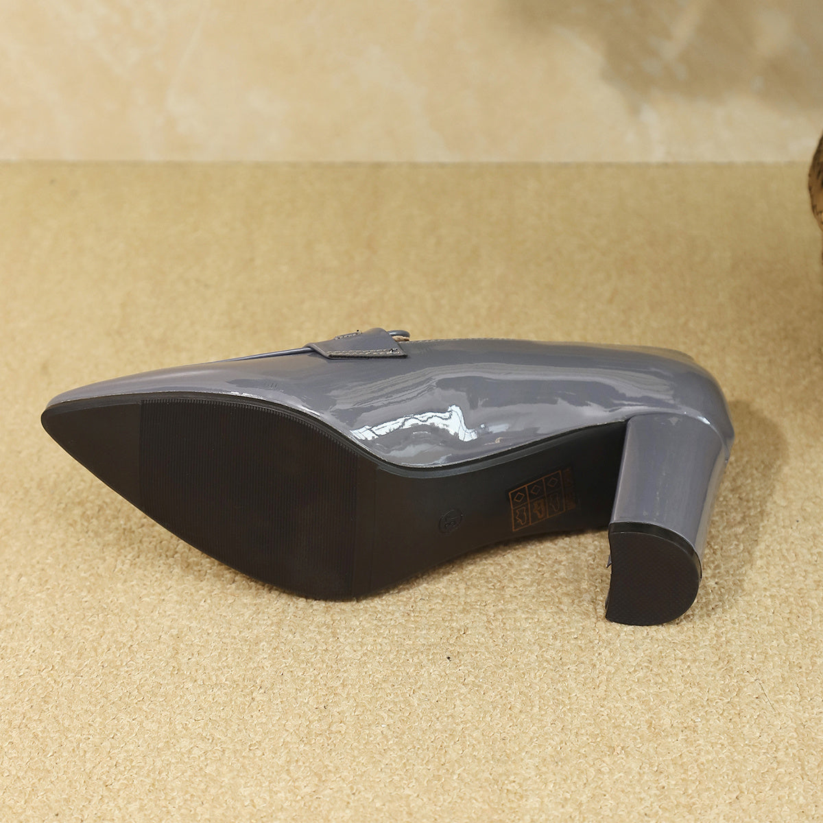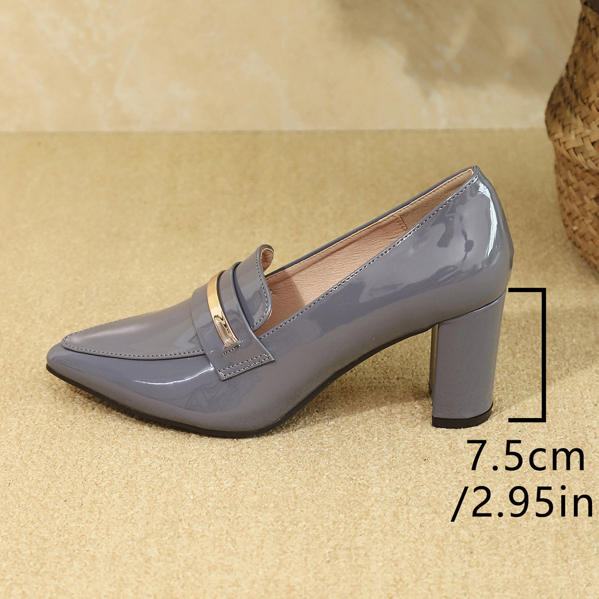 Women's Elegant Gray Mary Jane Pumps with Golden Accents - Pointed Toe, Chunky Heel, Faux Cover, Comfortable Work Shoes, Stylish Formal Wear|Elegant Pointed Pumps|Synthetic Cover Shoes