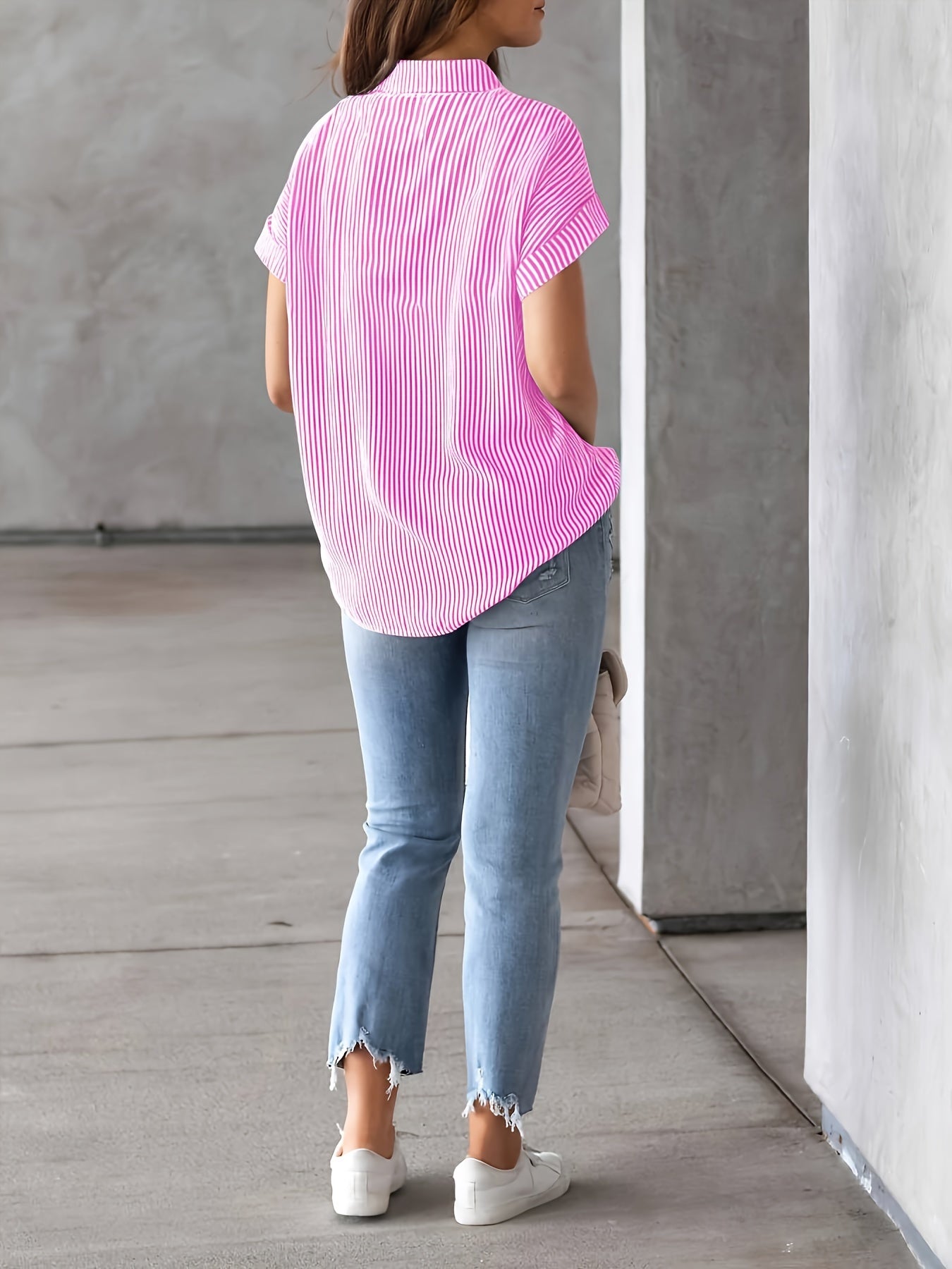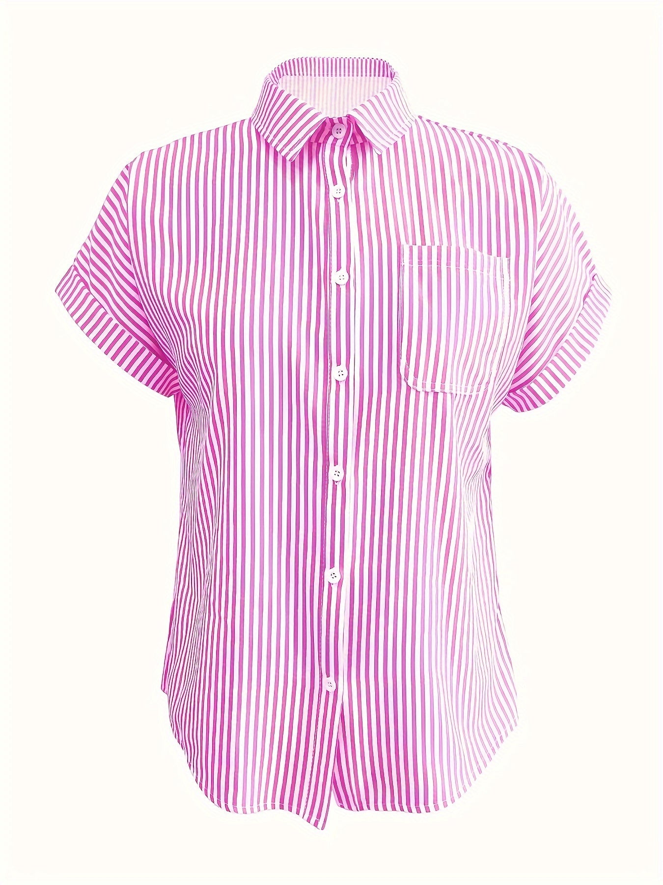 Women's Elegant Striped Drop Shoulder Short Sleeve Button-Up Shirt - Purple & White Vertical Stripes, Polyester, Machine Washable, Spring/Summer Casual Wear, Spring Fashion Top | Striped Blouse | Glossy Texture