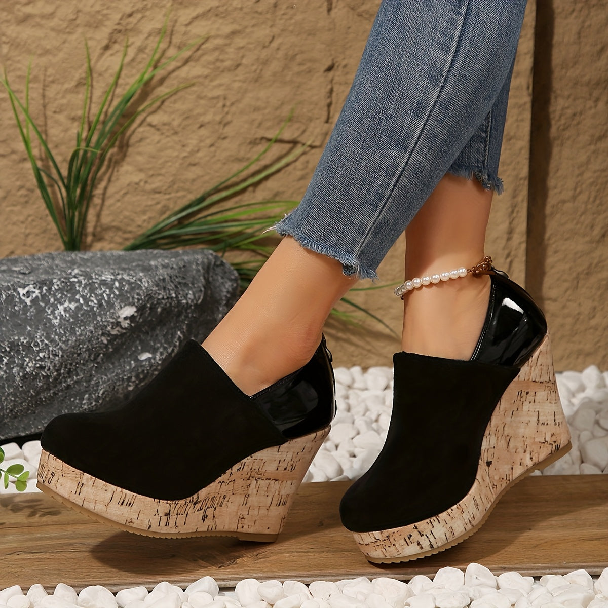 Women's Fashion Solid Color Wedge Heel Pumps with Back Zipper - Black & Navy Blue, Comfortable Fabric Upper & Rubber Sole, Stylish Thick-Heeled Design for Casual Attire