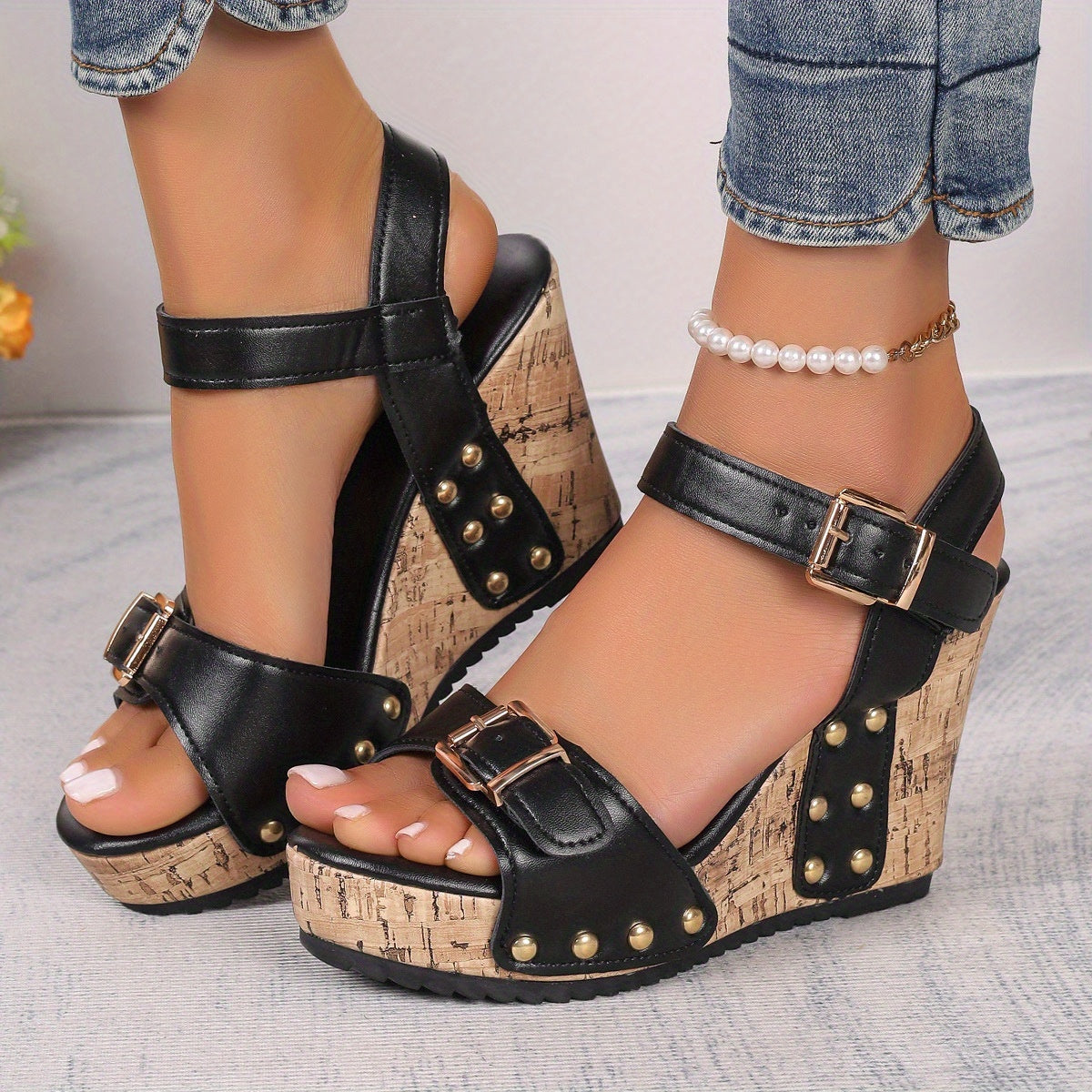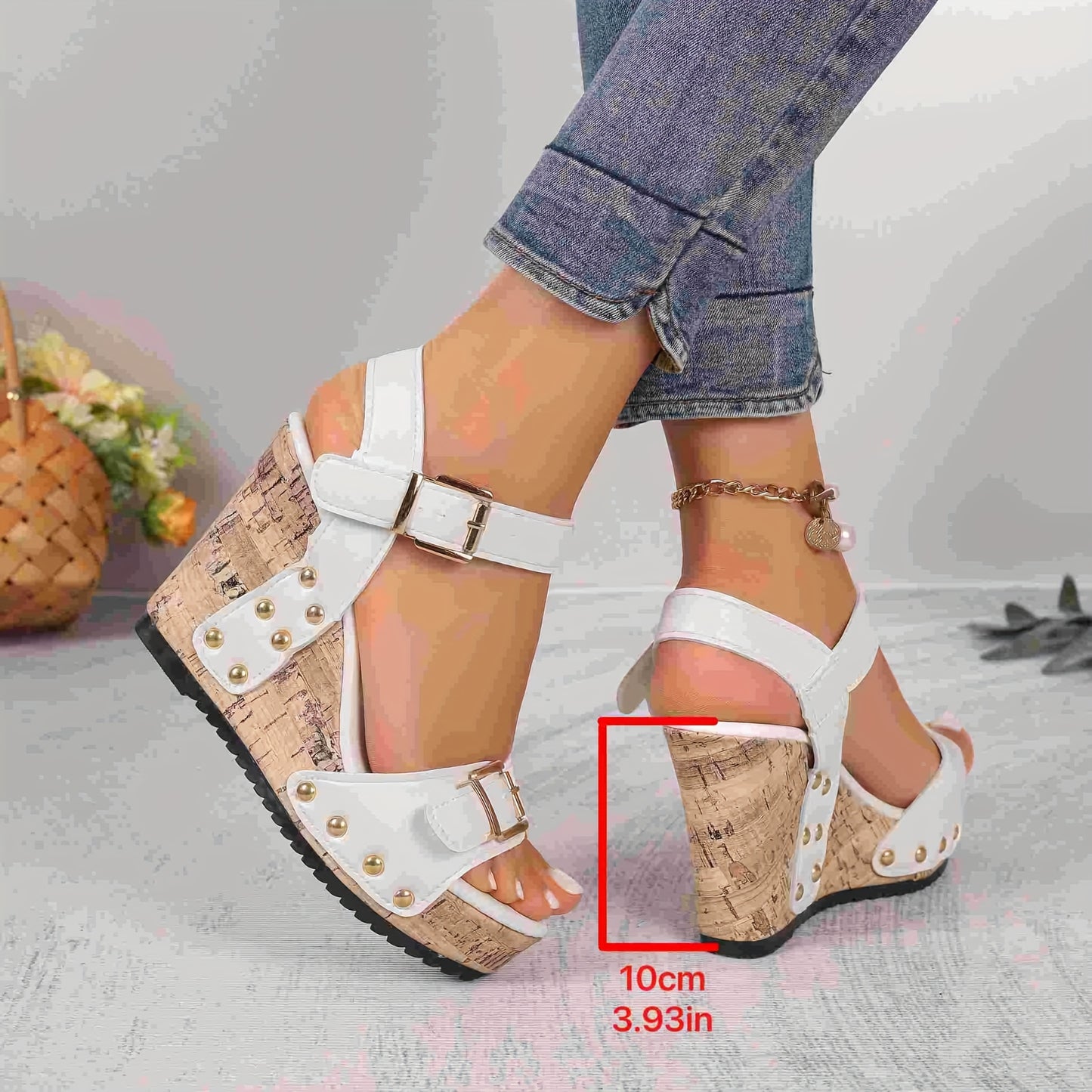Women'S Fashionable Wedge Sandals with Golden Tone Buckles and Decorative Stones - White, Open-Toe, Platform Heels for Summer, Casual & Formal Wear, Casual Footwear | Elegant Footwear | Durable Footwear