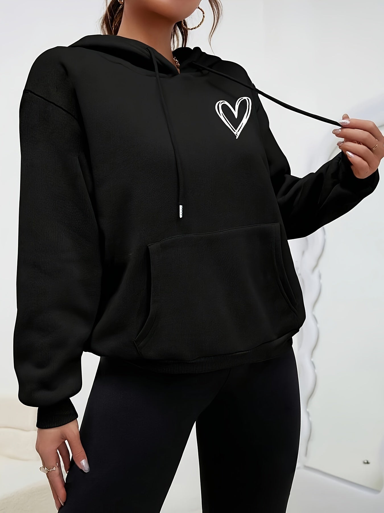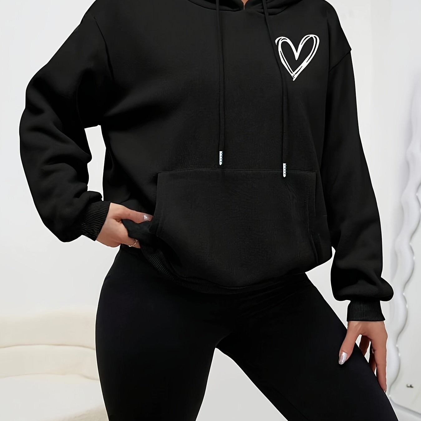 Women's Heart Print Hoodie With Kangaroo Pocket, Comfy Loose Drawstring Casual Sports Hooded Pullover Top For Fall & Winter, Women's Clothing