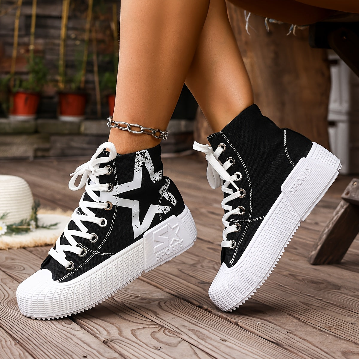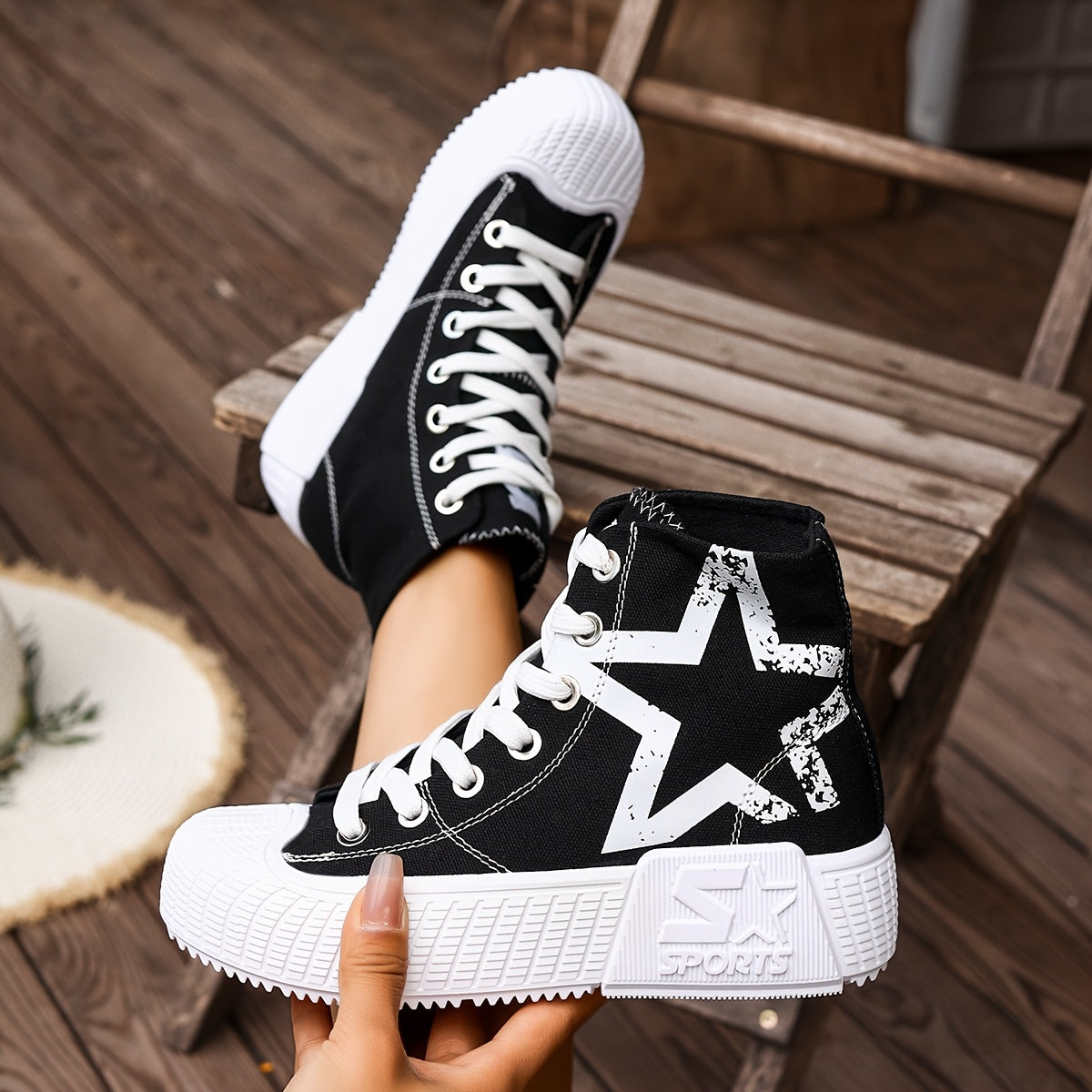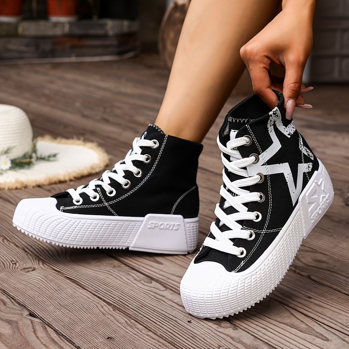 Women'S High-Top Star Print Sneakers - Black & White Casual Shoes with Thick Rubber Sole, Lace-Up Design, Comfortable Fabric Upper for All-Season Wear, Allseason Footwear | Star Print Shoes | Durable Rubber Sole