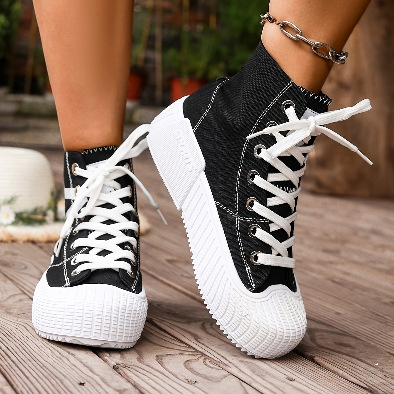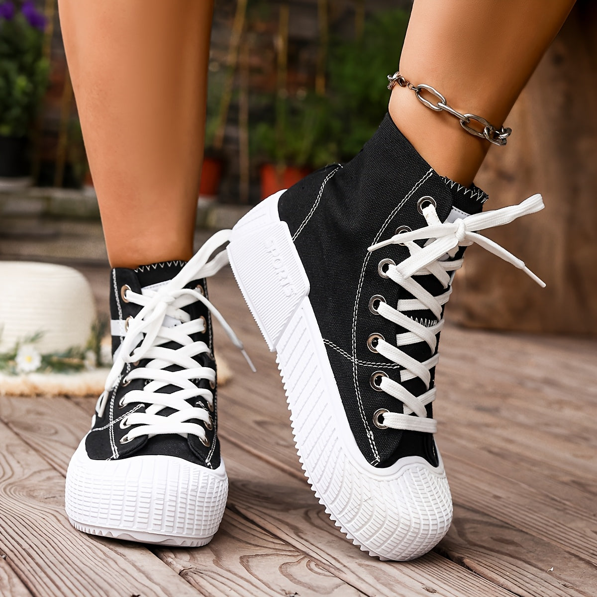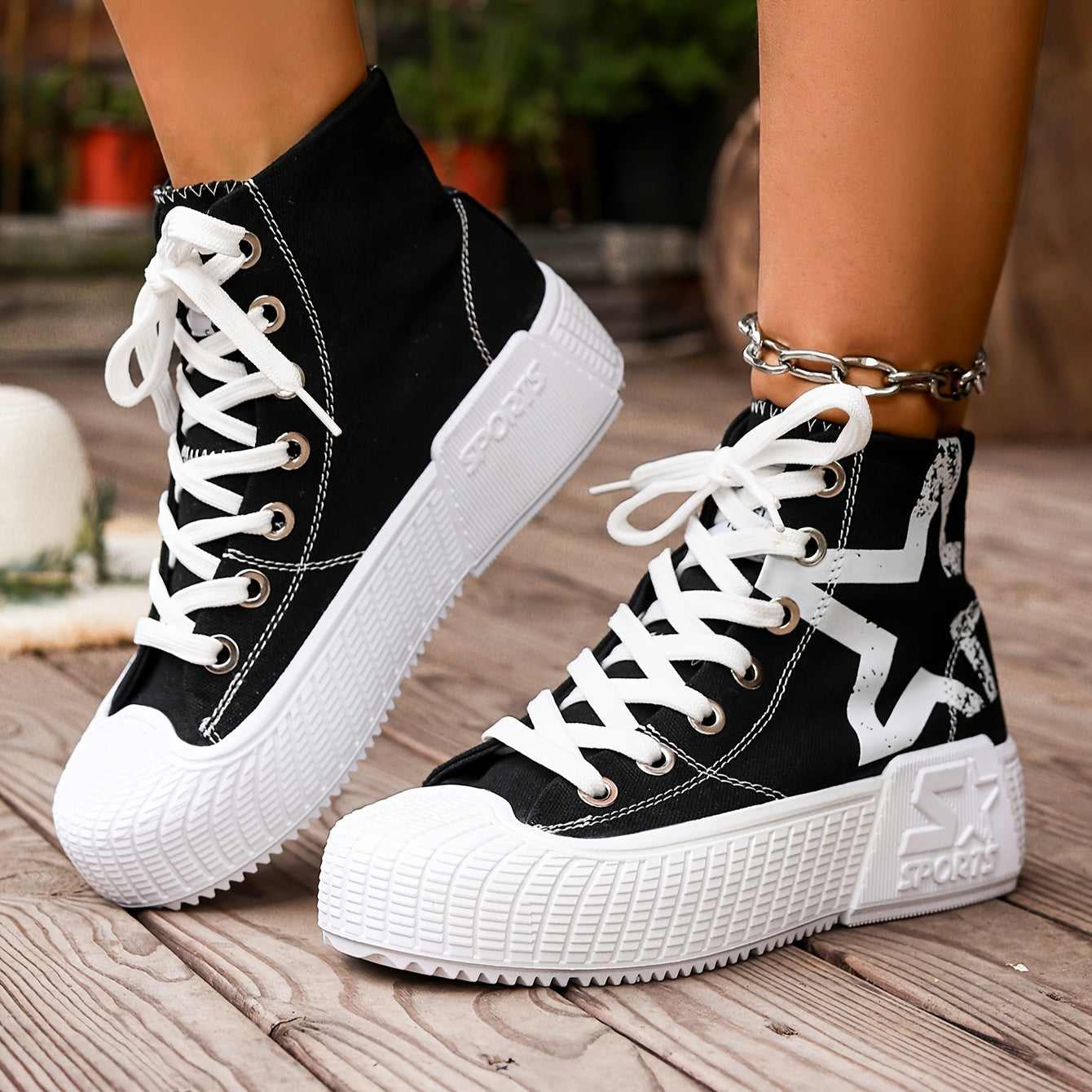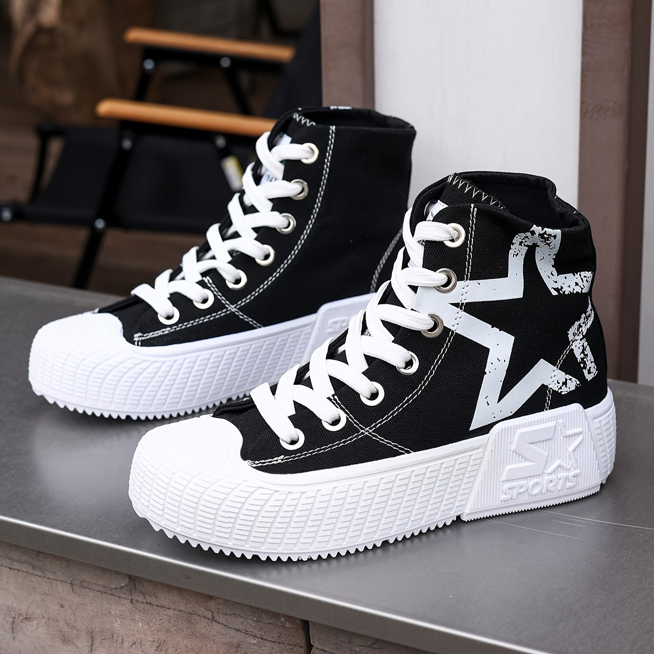 Women'S High-Top Star Print Sneakers - Black & White Casual Shoes with Thick Rubber Sole, Lace-Up Design, Comfortable Fabric Upper for All-Season Wear, Allseason Footwear | Star Print Shoes | Durable Rubber Sole