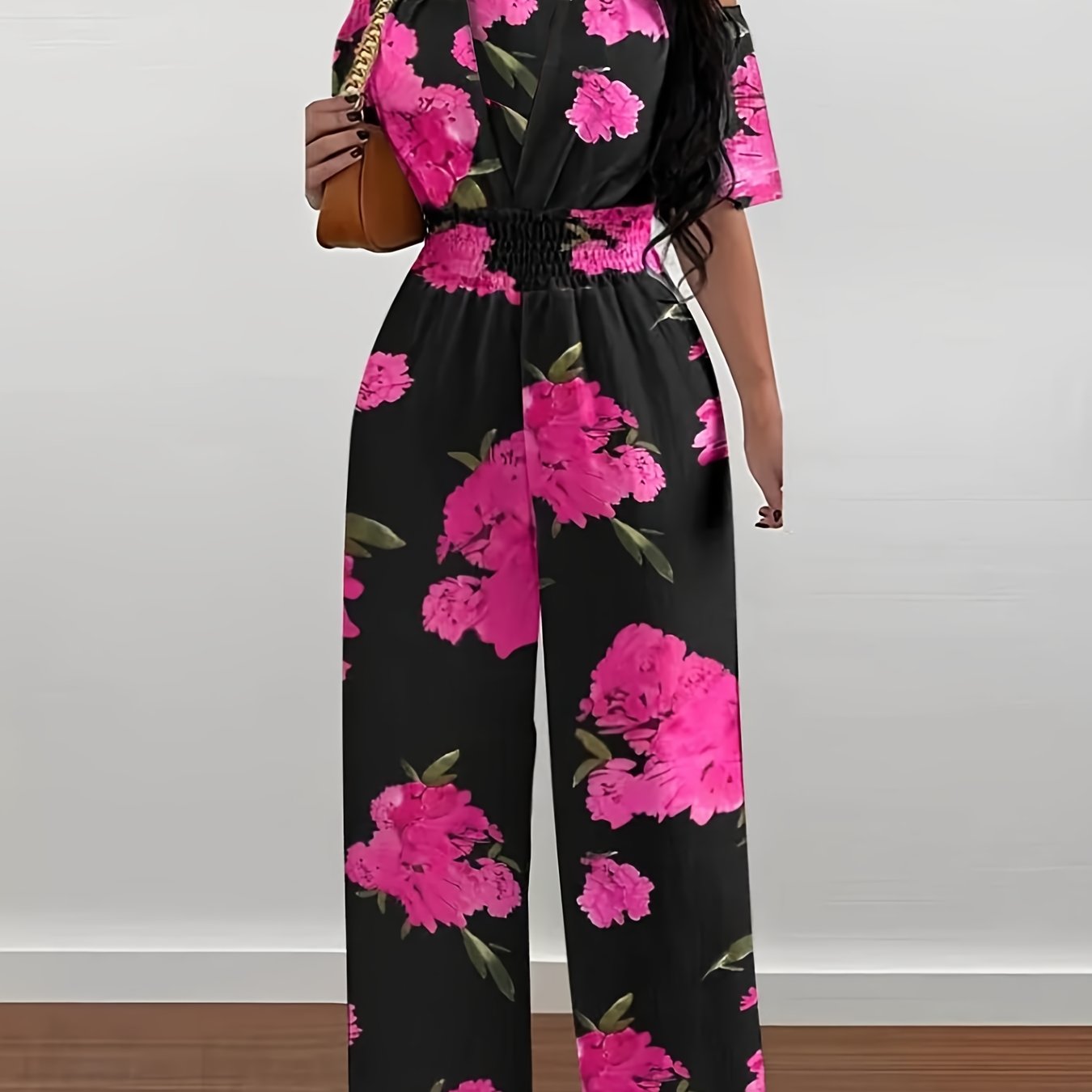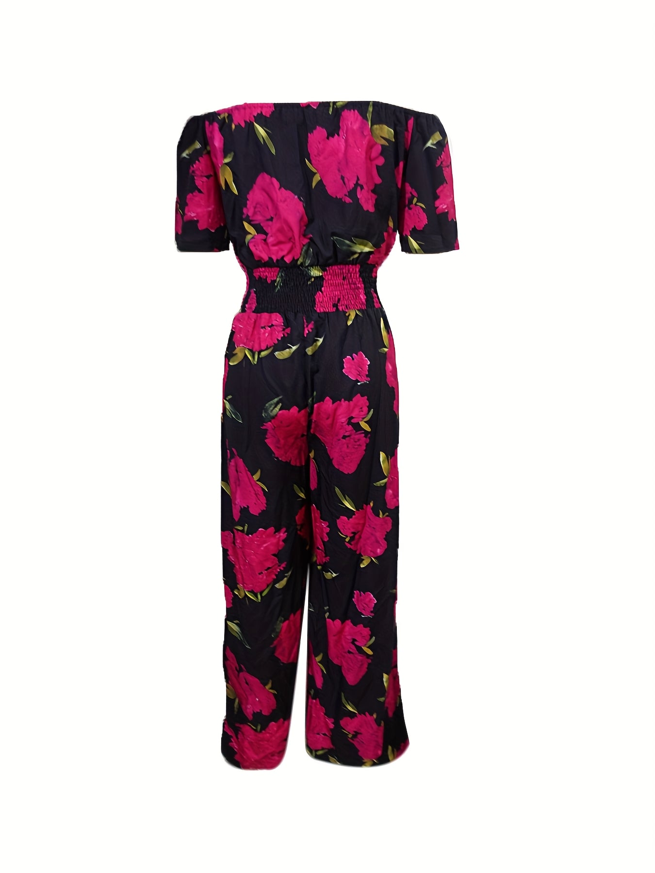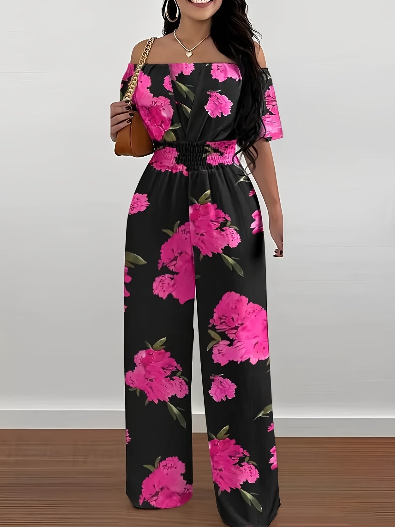 Women'S New Floral Print Off-The-Shoulder Straight-Neck Waisted Wide-Leg Jumpsuit