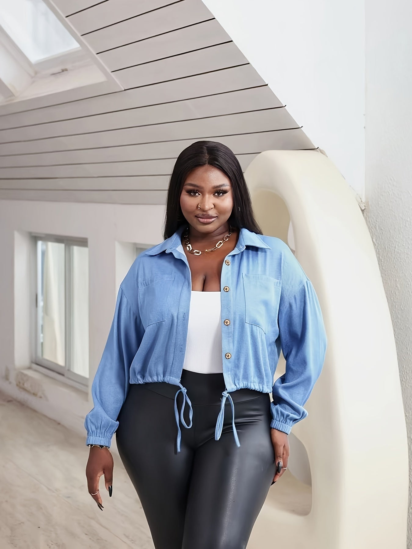 Women'S Plus Size Denim Shirt, Casual Style, Solid Color, Polyester Fabric, Woven, High Neck, Drawstring Detail, Non-Stretch, Fashion Top for All Seasons