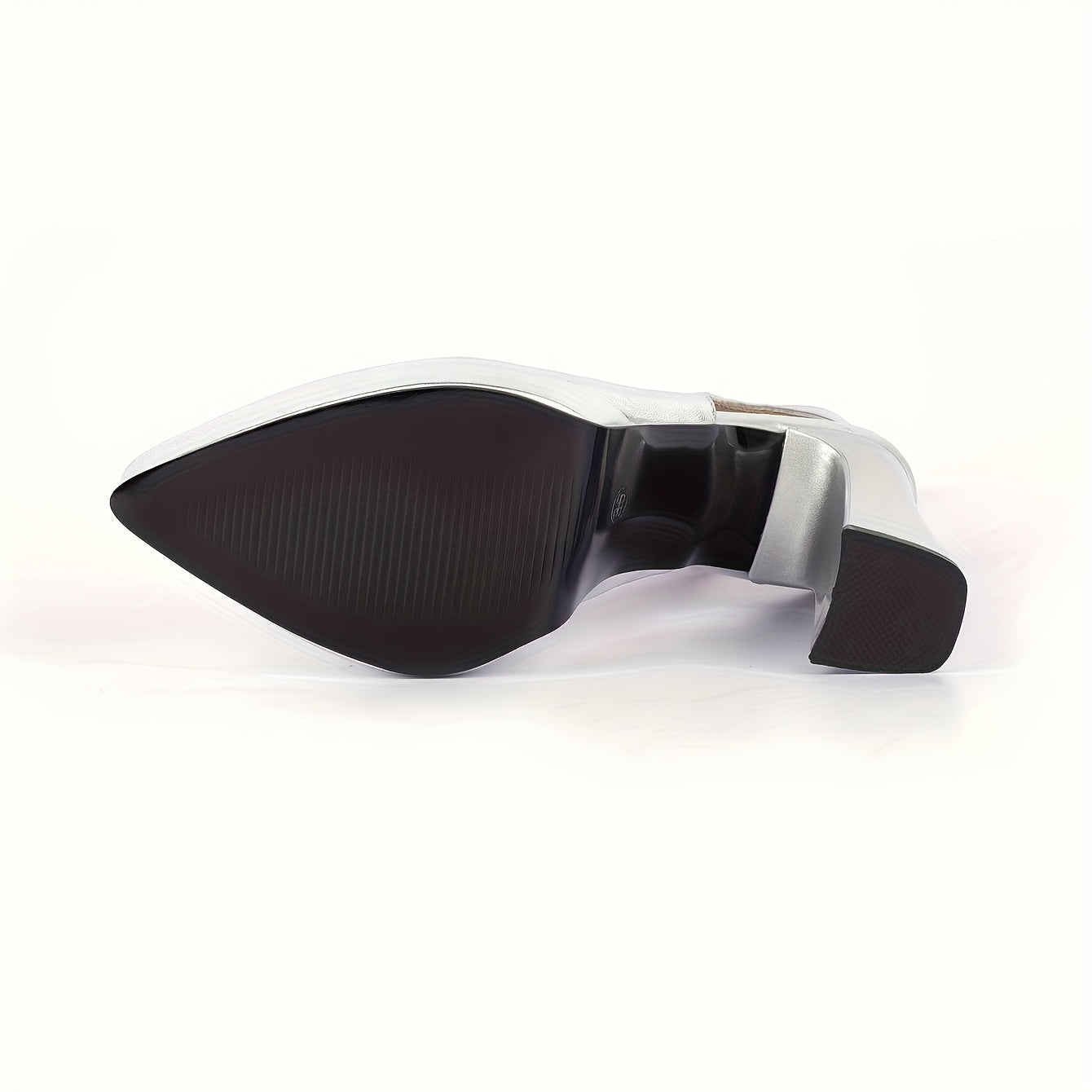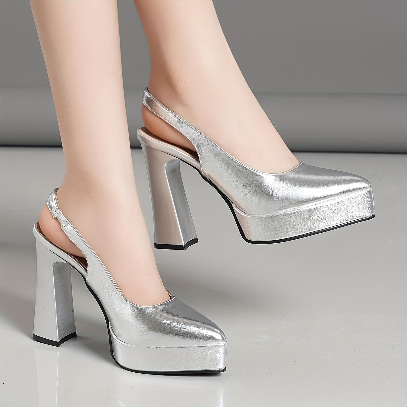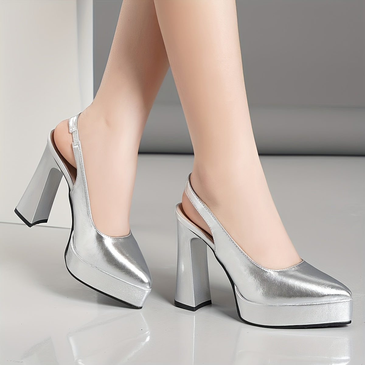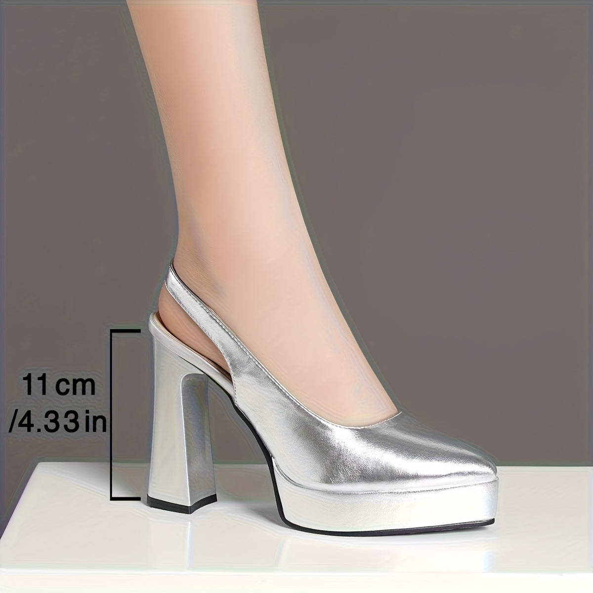 Women'S Pointed Toe Block Heel Pumps - Synthetic Cover High Heels with Thick Platform Sole, Metallic Silvery Gray, Comfortable Summer Dress Shoes for Office & Formal Events, Office Shoes, Sleek Shoe Design, Durable Rubber Sole