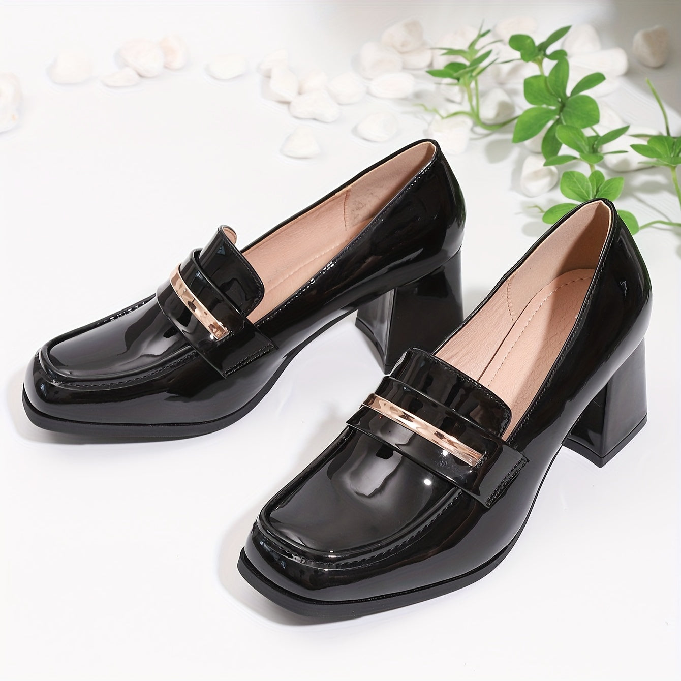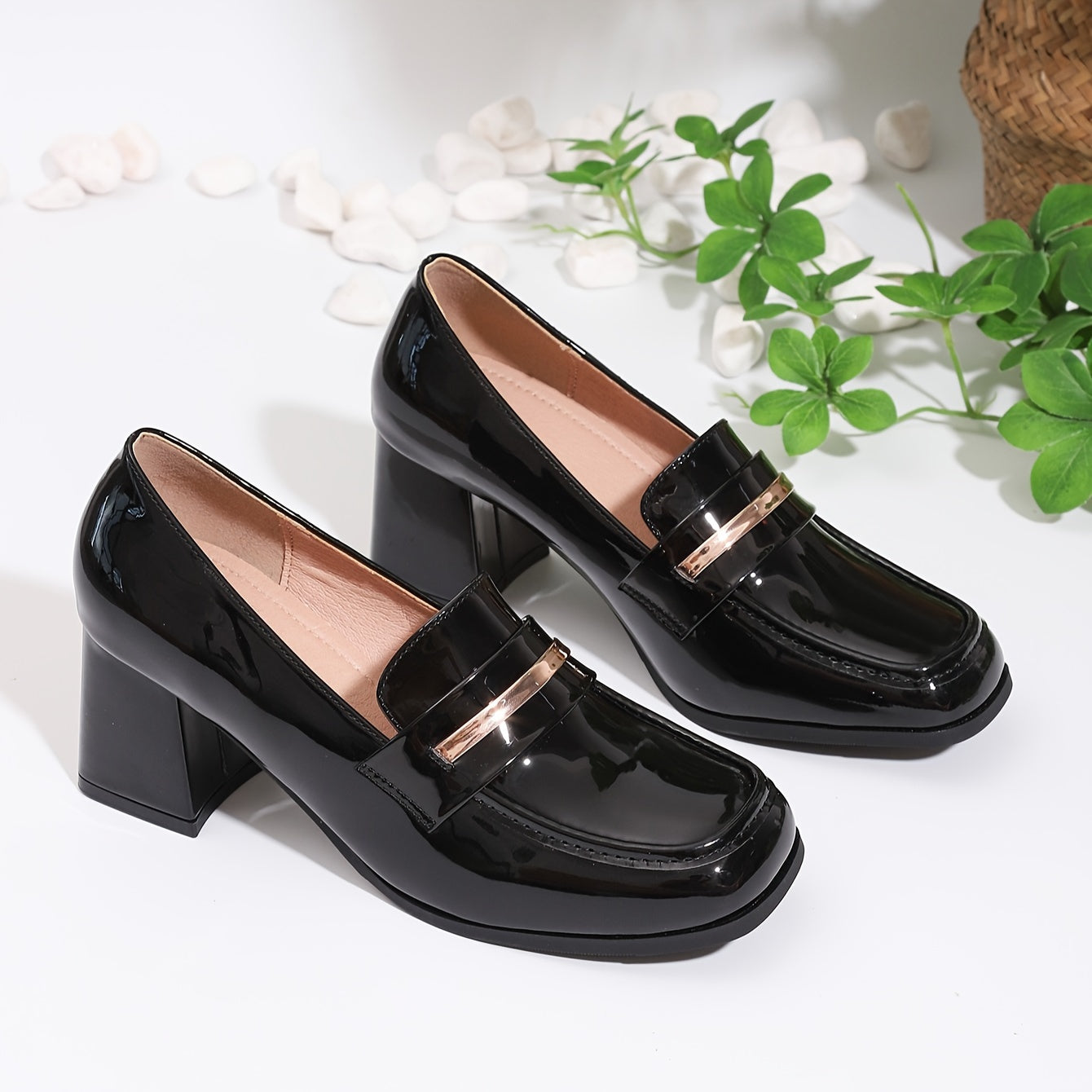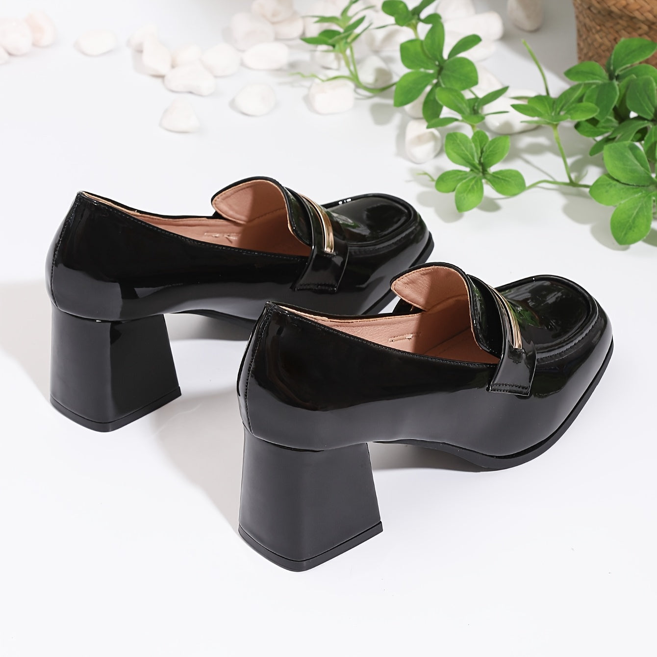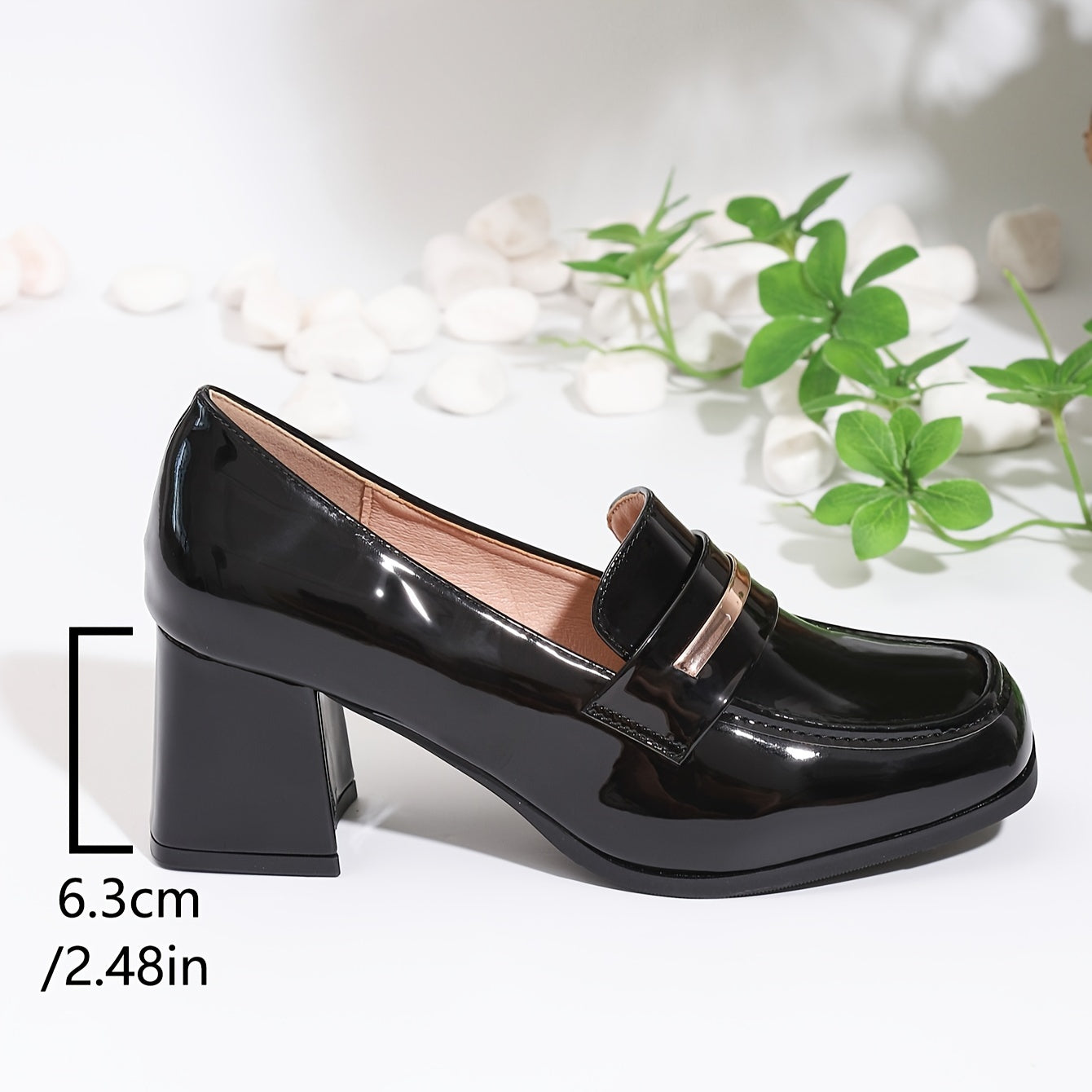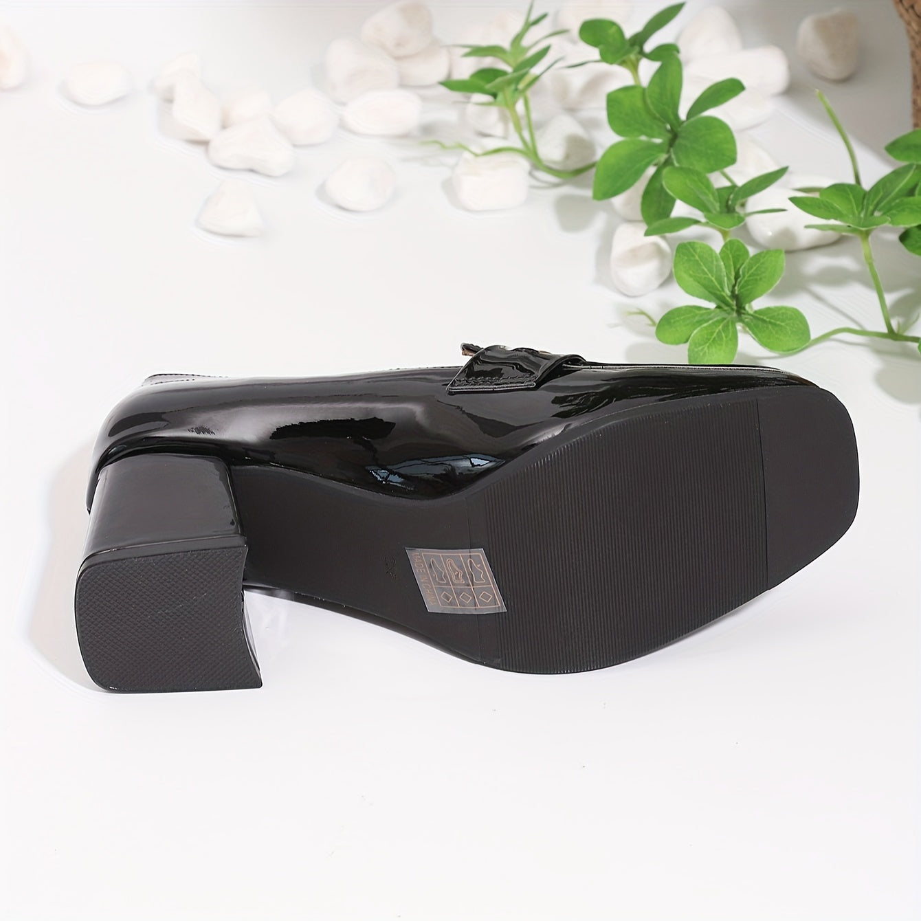 Women's Retro British Style Chunky High Heel Pumps - Glossy Black Synthetic Cover Square Toe Shoes with Comfortable Block Heel for Professional & Formal Occasions, Business Attire Shoes, Polished Finish Shoes