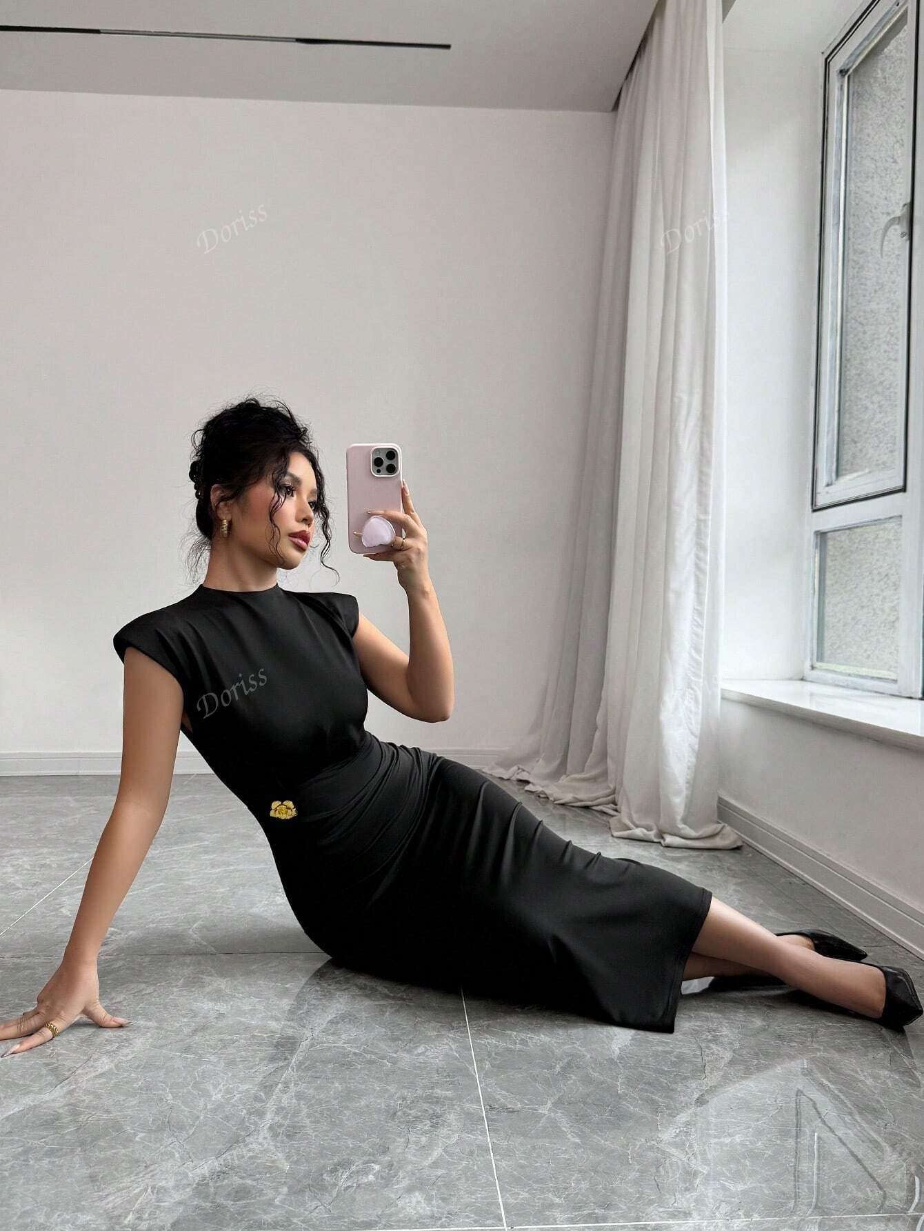 Women's Simple Round Neck Elegant Metal 3D Flower Decor Casual Long Dress