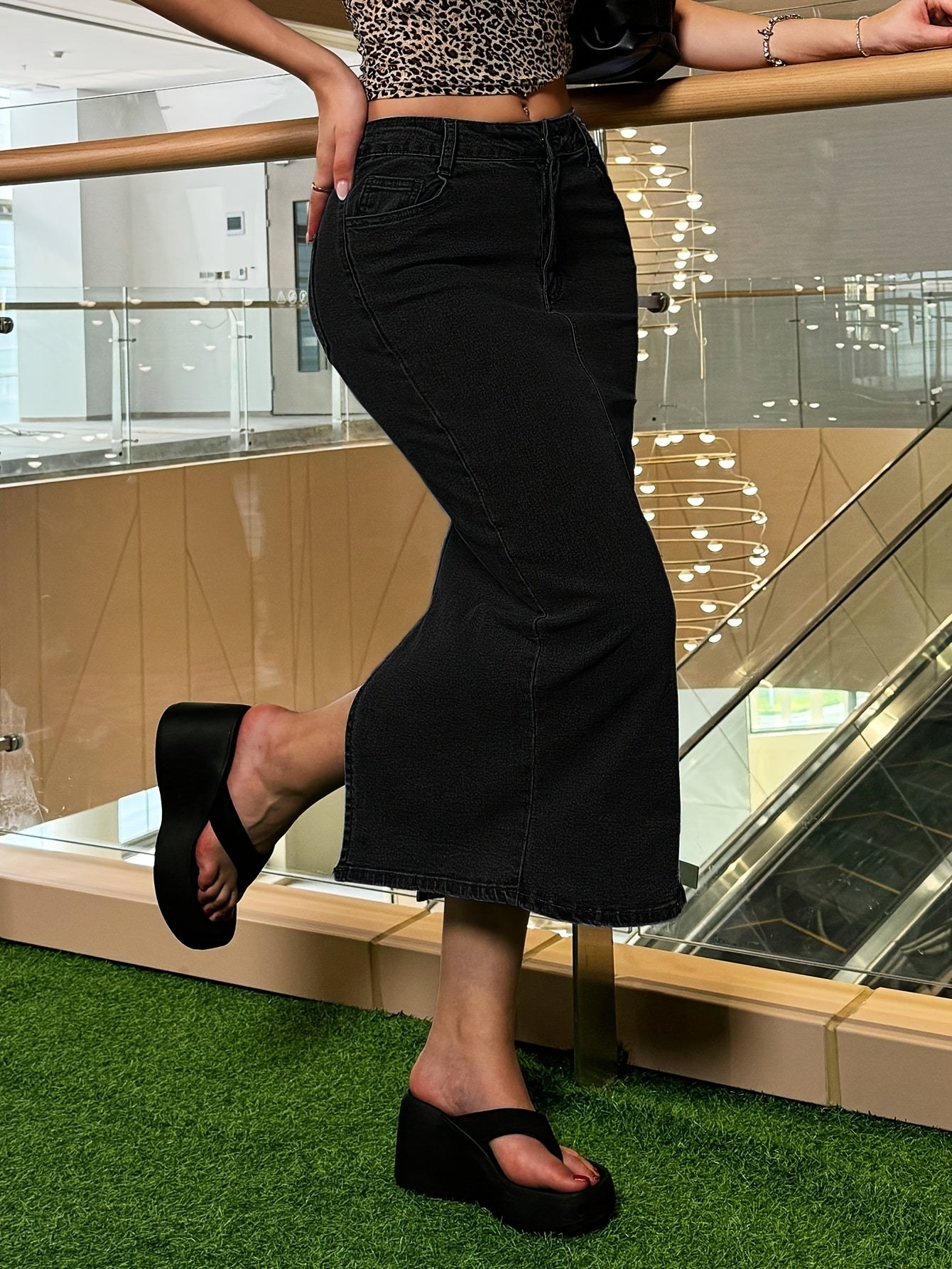 Women's Slim-Fit Mid-Length Denim Skirt with Stretch, Back Slit Detail & Pockets - Casual Midi Jean Skirt for Spring/Summer/Fall