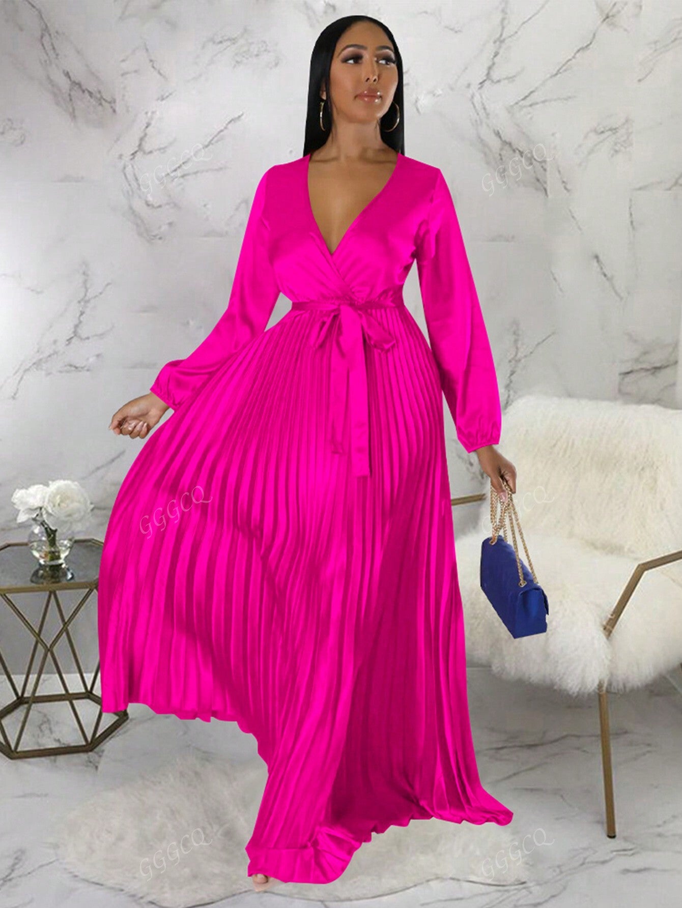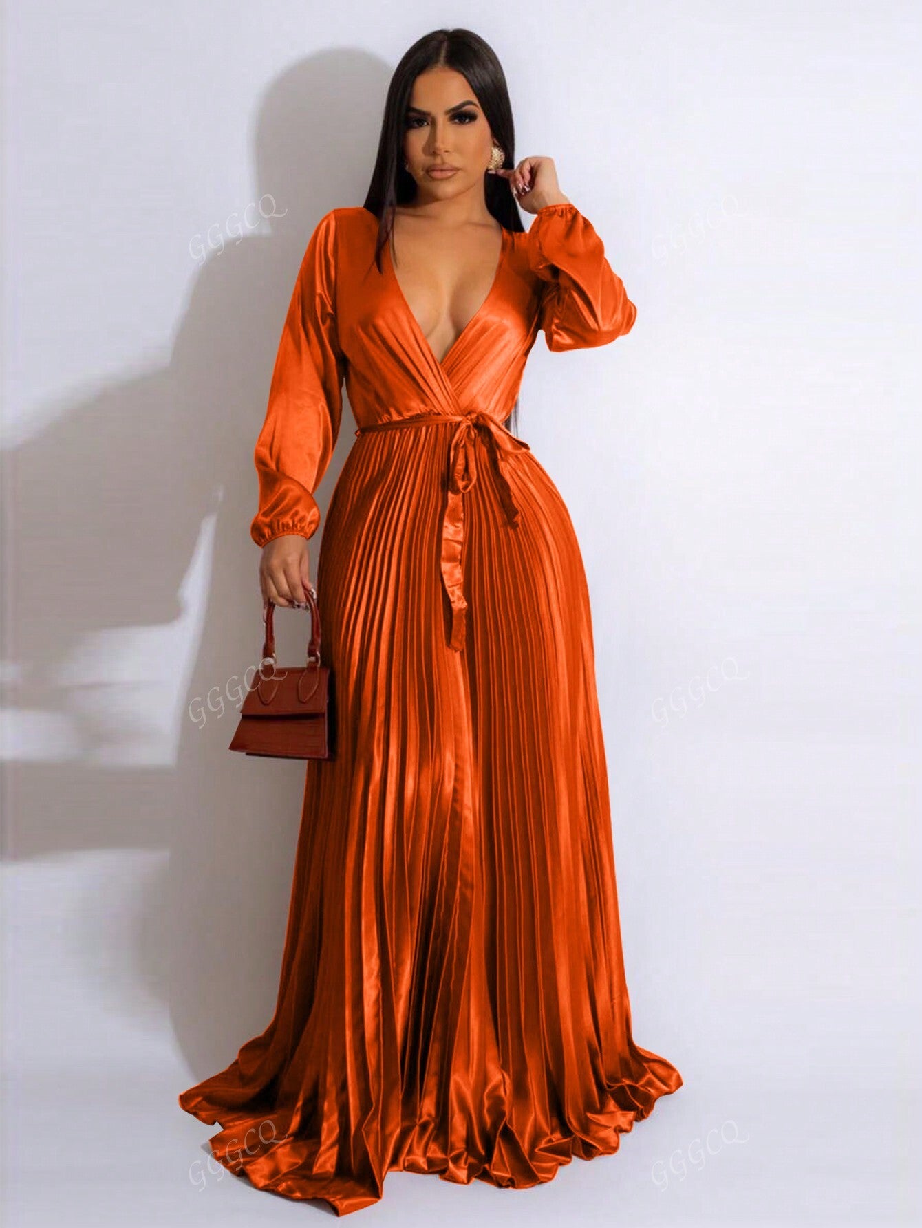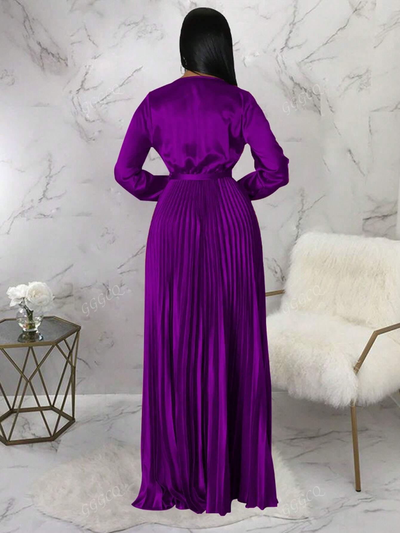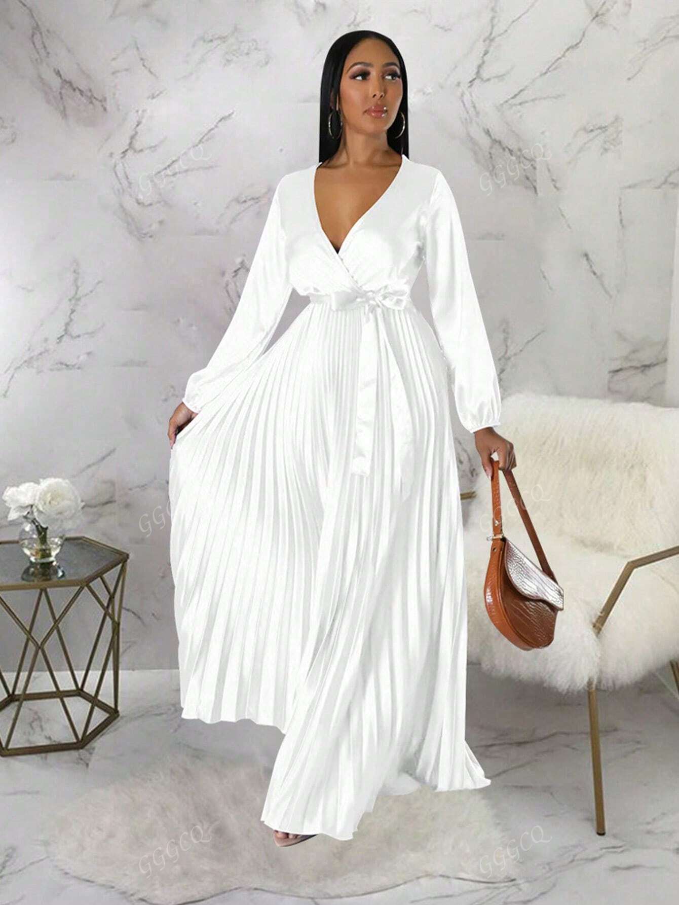 Women's Solid Color Long Sleeve Pleated Waisted Party Dress