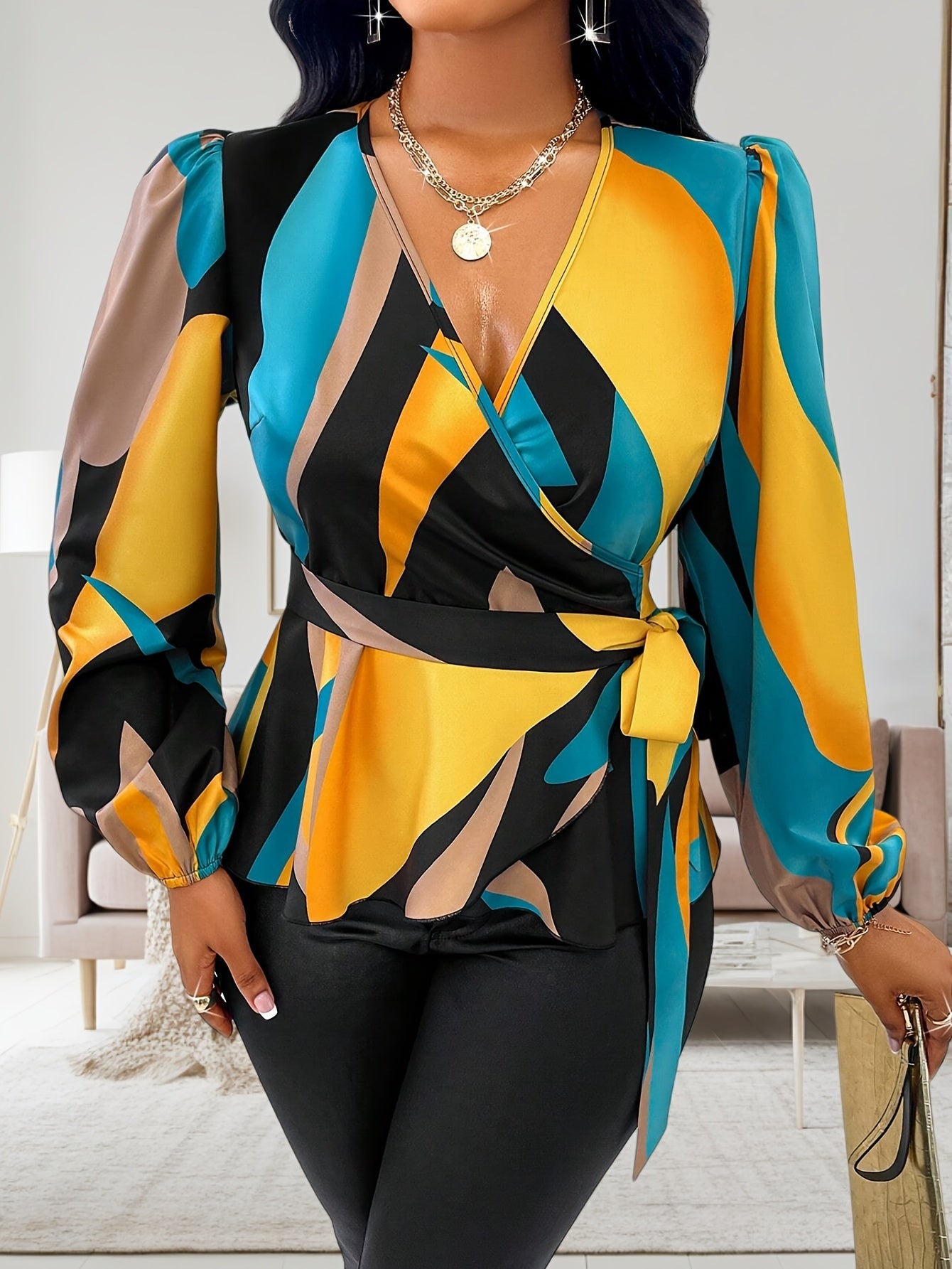 Women's Stylish V-Neck Long Sleeve Geometric Print Blouse, Polyester and Elastane Blend, Middle-Eastern Inspired Woven Top for Spring/Summer/Fall Seasons