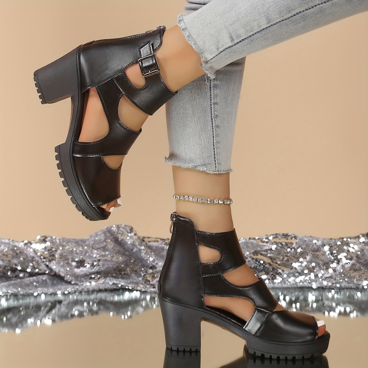 Women'S Summer High-Heel Shoes - Black Peep-Toe, Strappy, Block Heel with Ankle Strap, and Non-Slip, Synthetic Upper, Rubber Sole, Stylish Ankle Accessory|Peep Toe Shoes|Synthetic Upper, High Heel Shoes