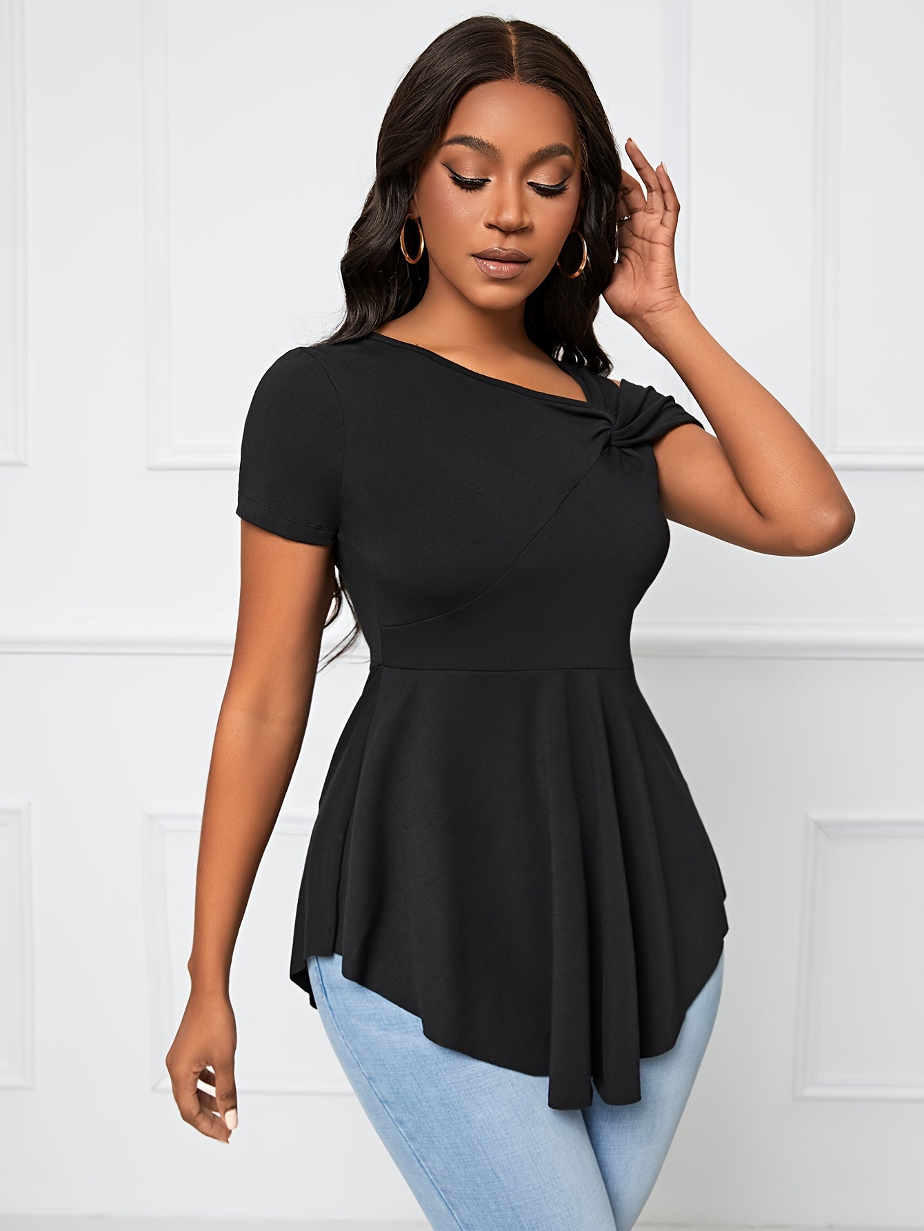 Women'S Summer Knit Top, Asymmetrical Neck Solid Color Polyester Tee, 95% Polyester 5% Elastane, Lightweight 180g/m², Regular Length Fashion Pullover Shirt