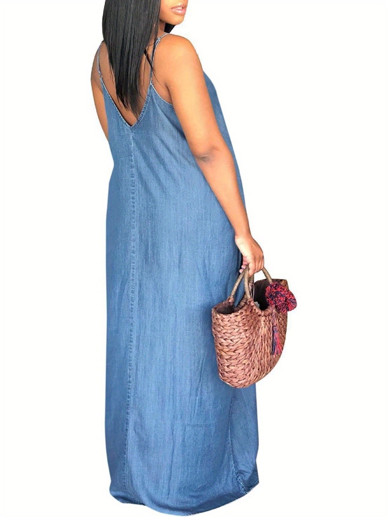 Womens Summer Spaghetti Strap Dresses Casual Denim Deep V Neck Loose Maxi Dress