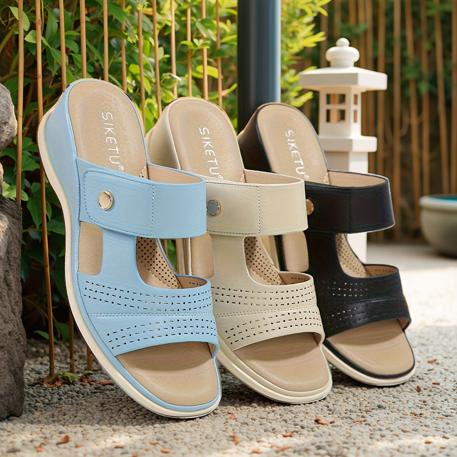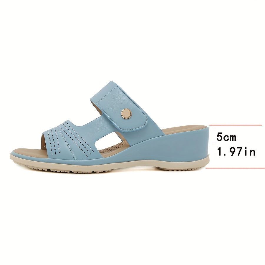 Women'S Two-Strap Wedge Sandals with Metal Buckle Accents – Comfortable Slip-On Design, Open Toe, Mid-Heel, Available in Beige, Black, and Brown, in Two Colors, Two Straps, Comfortable Walking