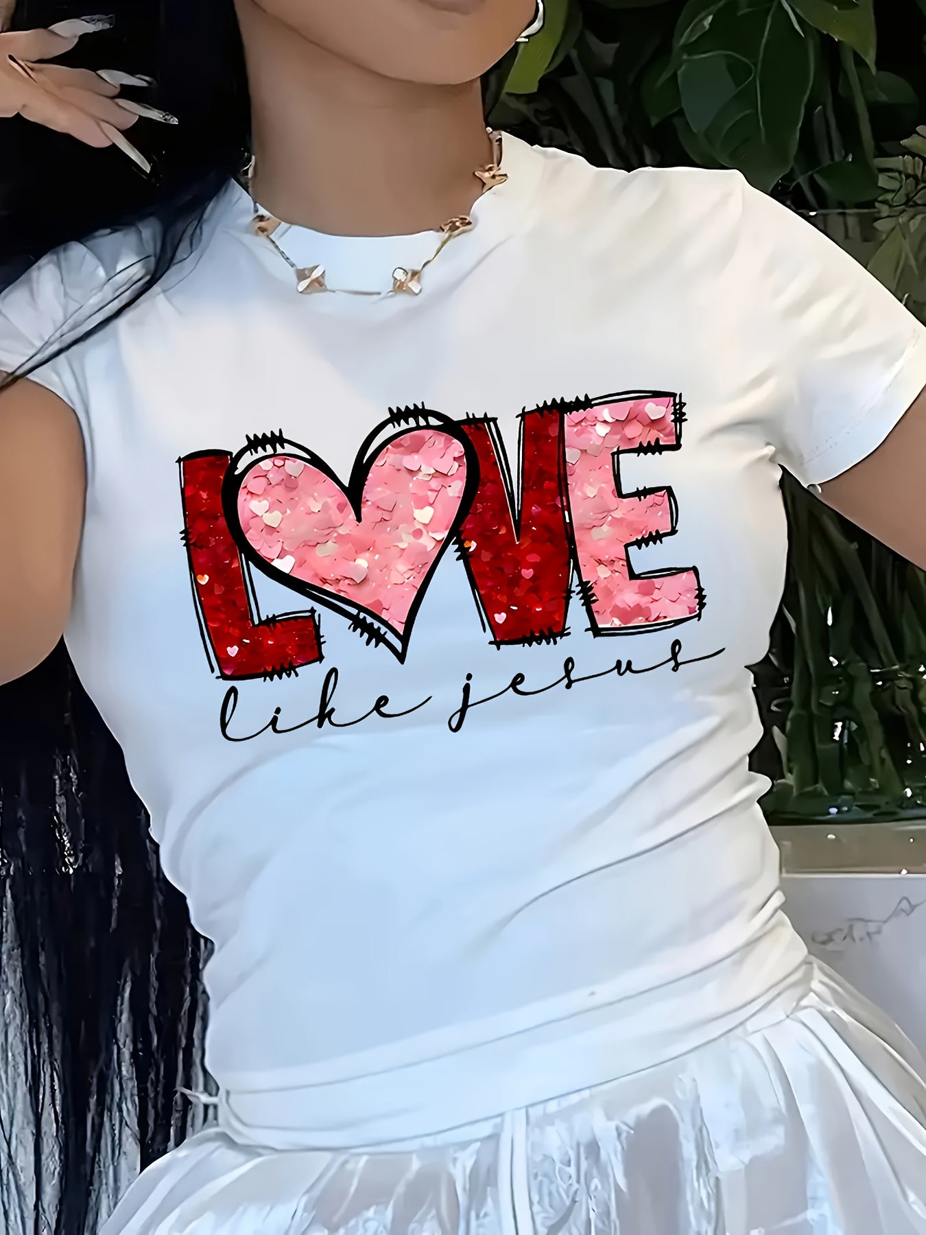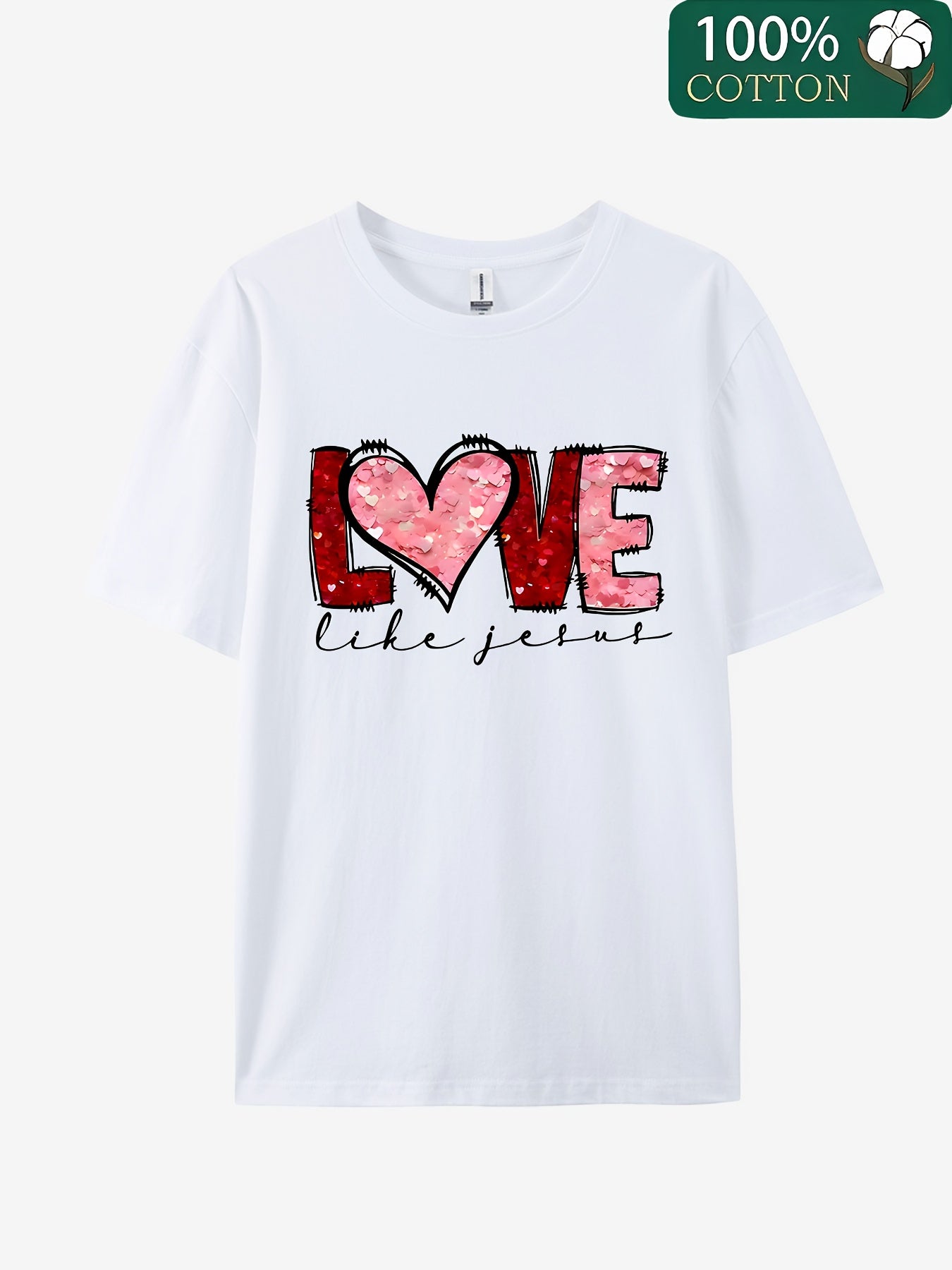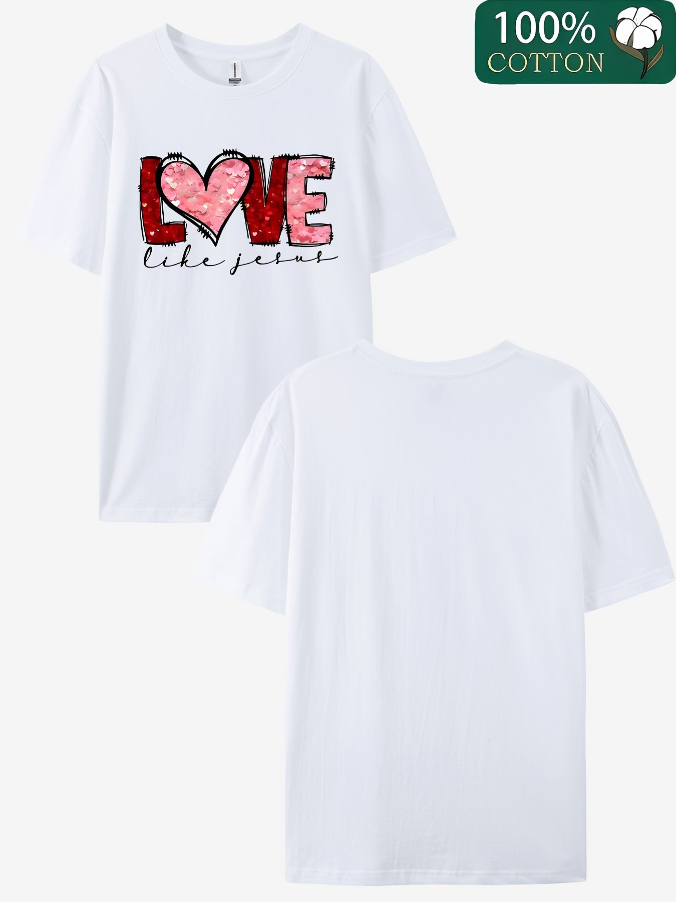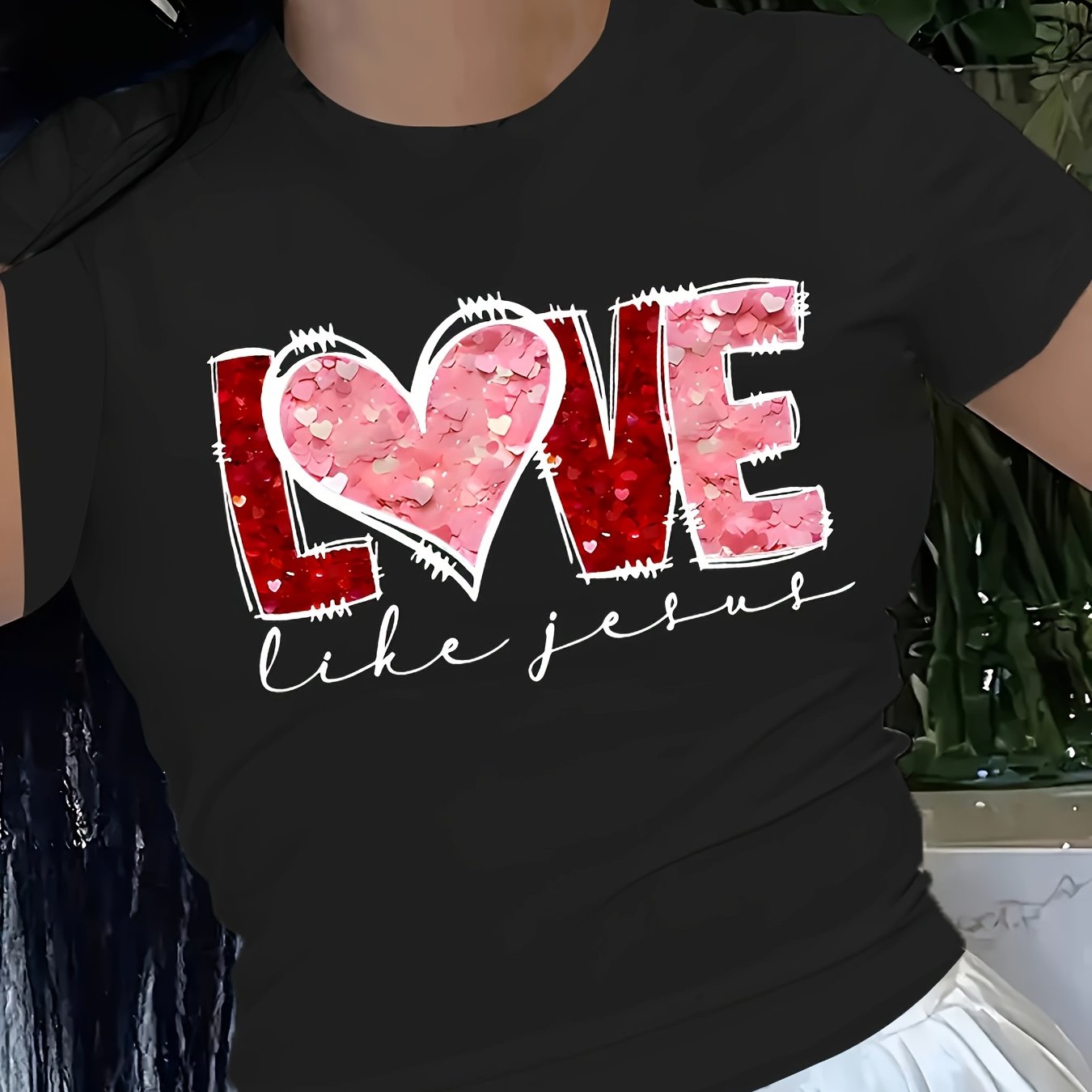 Women's Valentine's Day LOVE Glitter Graphic T-Shirt - Casual 100% Short Sleeve Tee with "Love Like Jesus" Design, Machine Washable, Perfect for Spring and Summer, Valentines Day Gifts