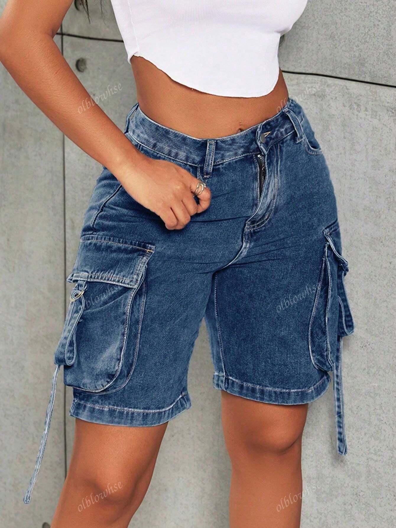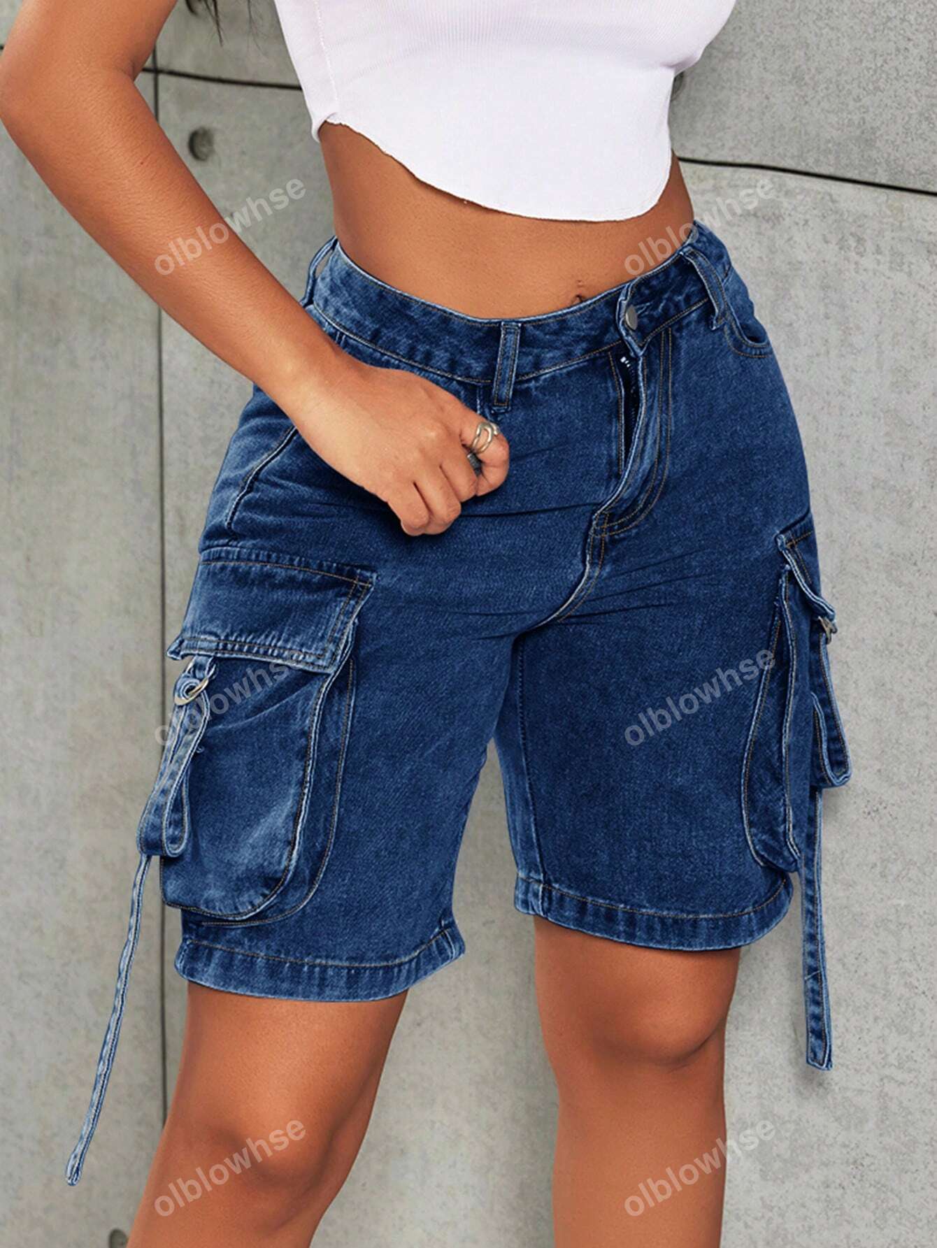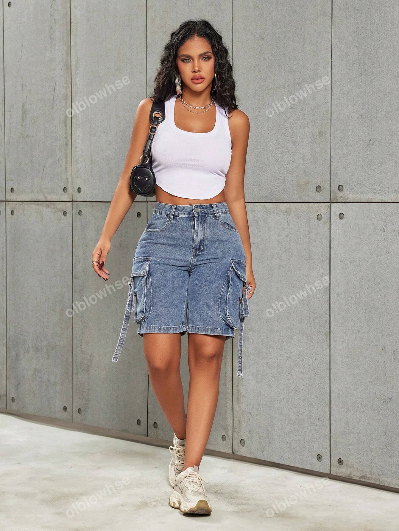 Y2K Street High Waist Flap Pocket Tape Detail Work Cargo Denim Bermuda Wide Leg Jean Shorts Summer Comfy Jorts