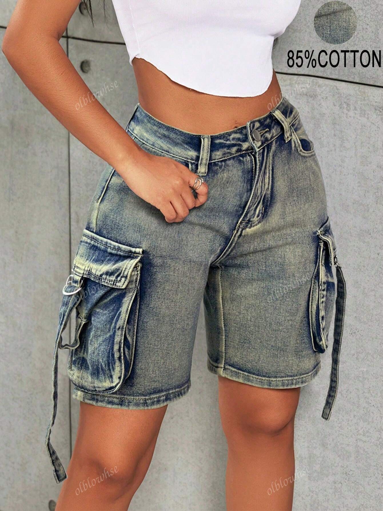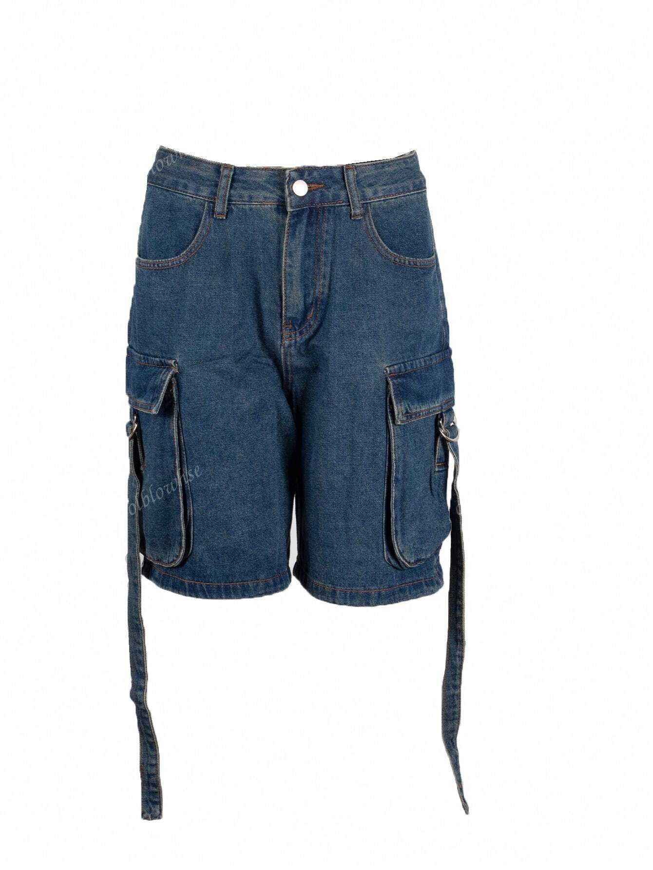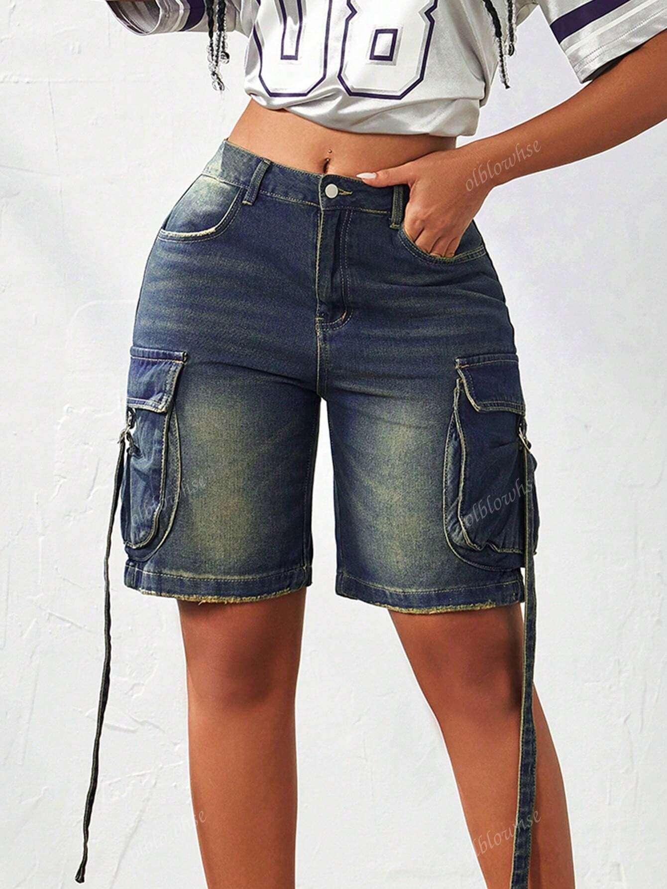 Y2K Street High Waist Flap Pocket Tape Detail Work Cargo Denim Bermuda Wide Leg Jean Shorts Summer Comfy Jorts