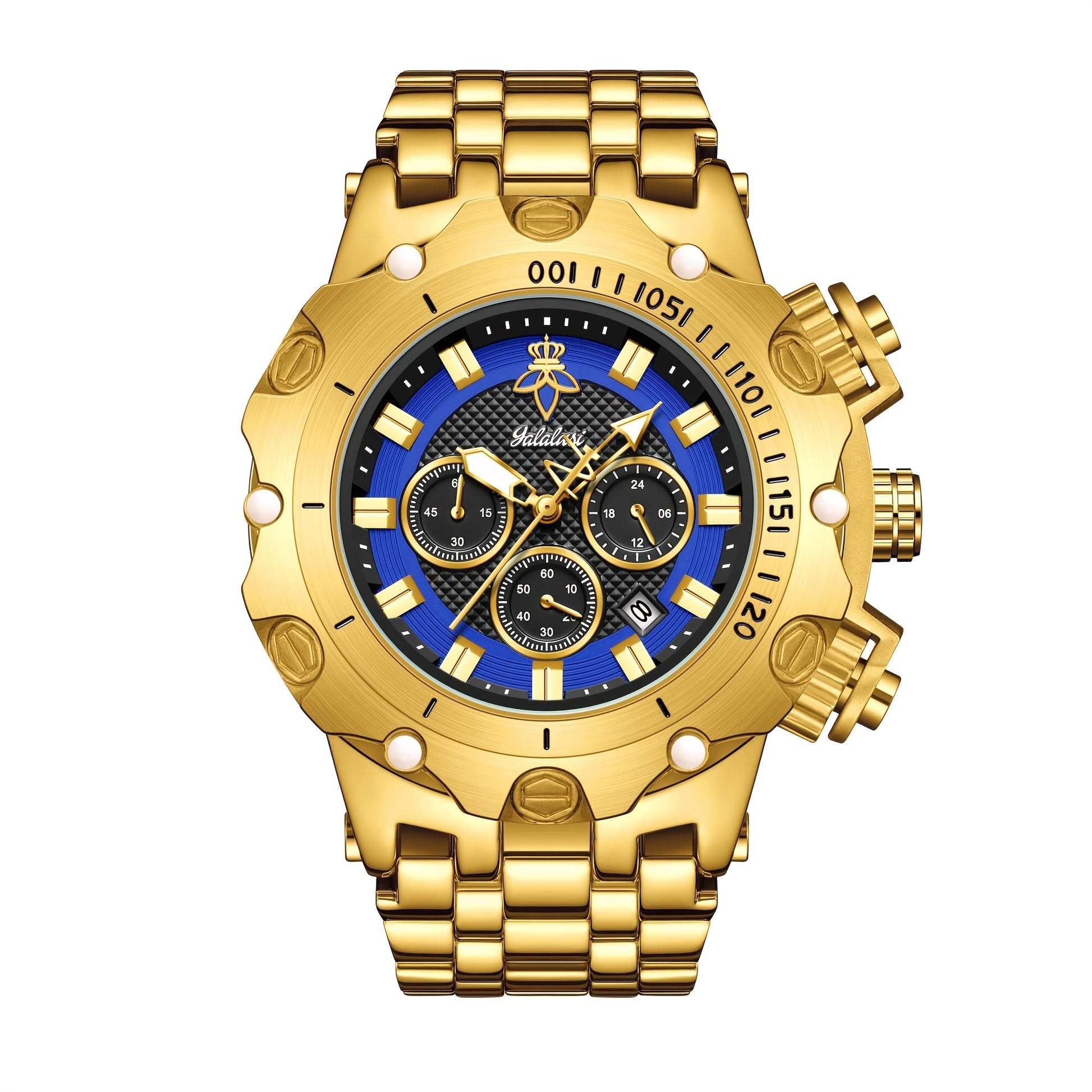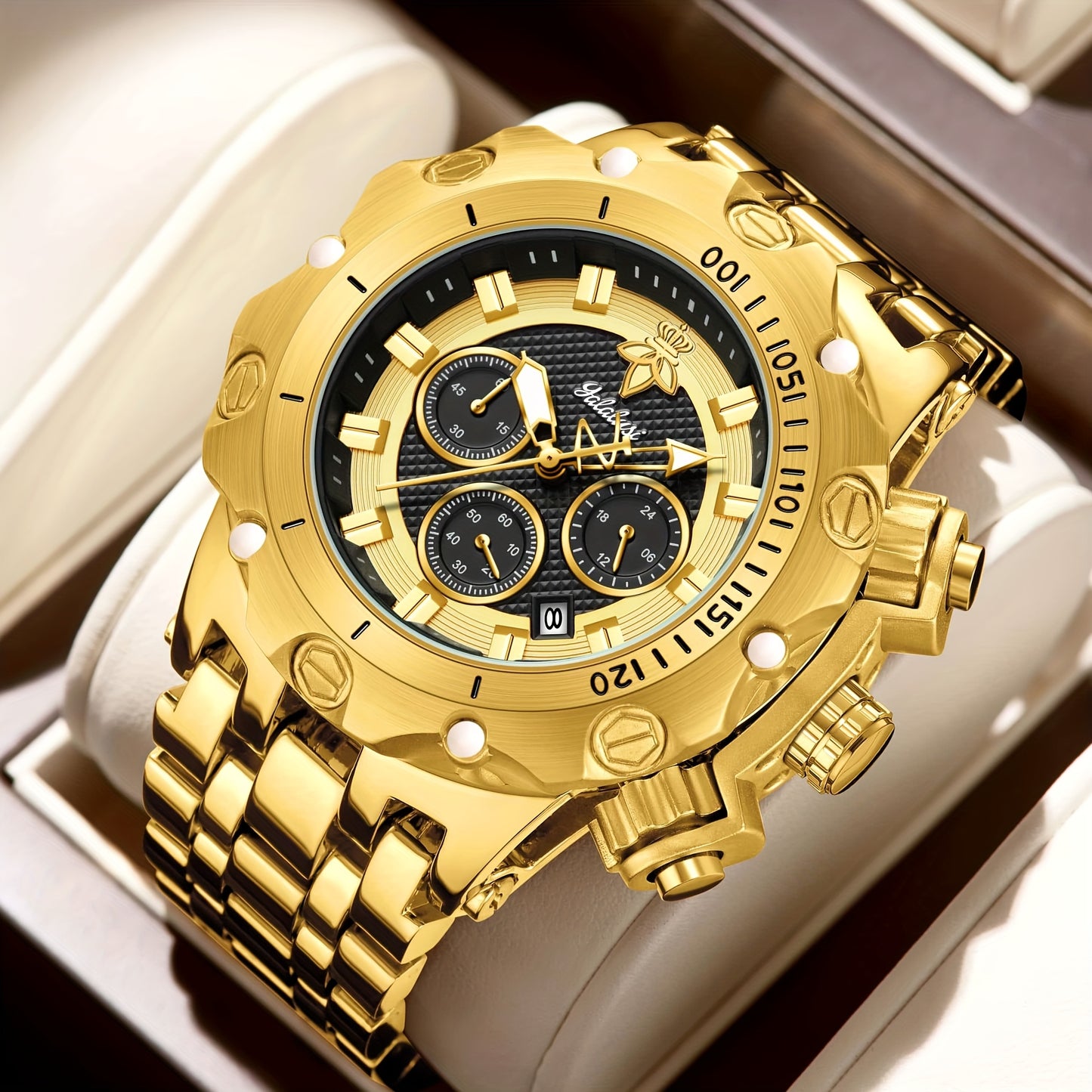 YaLaLuSi Men's Golden-Tone Quartz Watch with Calendar, Night Light, and Chronograph Functions - Stylish Streetwear Design, Durable Alloy Strap, Includes Strap Adjuster & Gift Box - Perfect Gift for Father, Boyfriend, or Friends