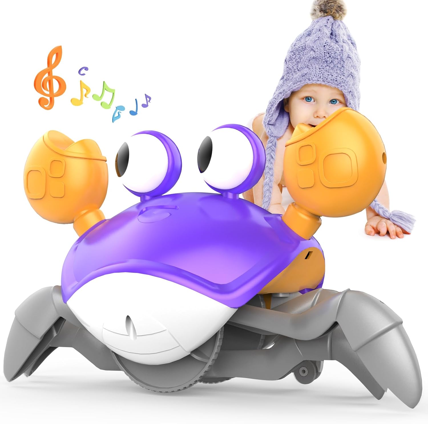 - Baby Happy Tummy Time Toys: Our crawling crab toys make tummy time fun and happy. Bright colors, sparkling lights, cheerful music and sideways walking are right in front of babies 0 to 6 months, attracting their attention, they love listening to music and can't help waving their arms and legs following the music. it's not only a great toy for babies to exercise their muscles, but serve as valuable learning systems to enhance their motor skills development